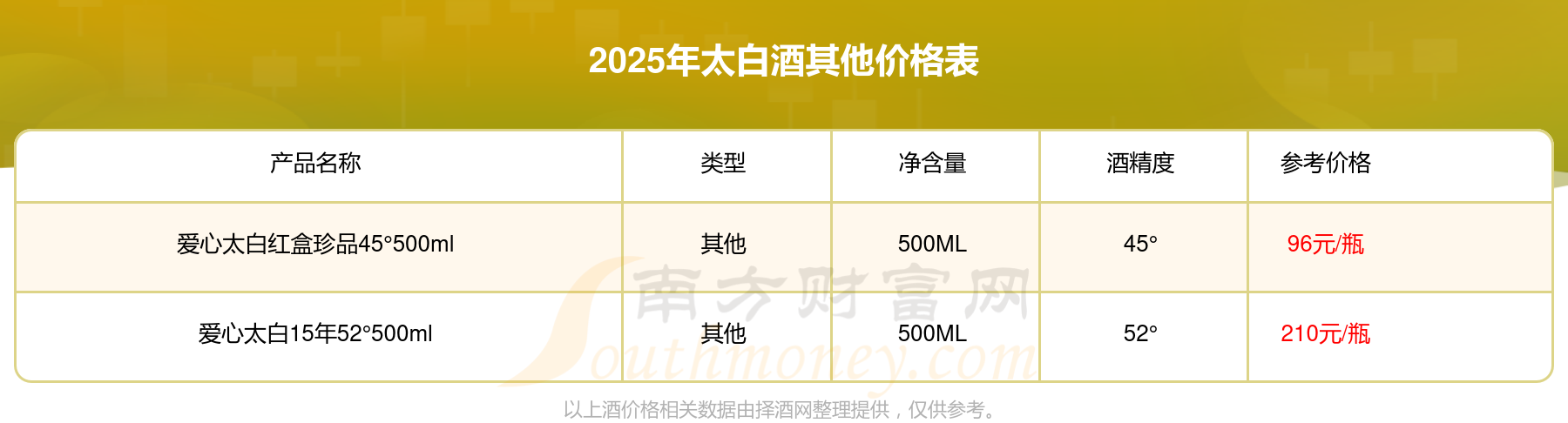 2025年,愛心太白15年52°500ml、愛心太白紅盒珍品45°500ml等太白酒其他酒參考價格如下:愛心太白15年52°500ml參考價210元、愛心太白紅盒珍品45°500ml參考價96元。
