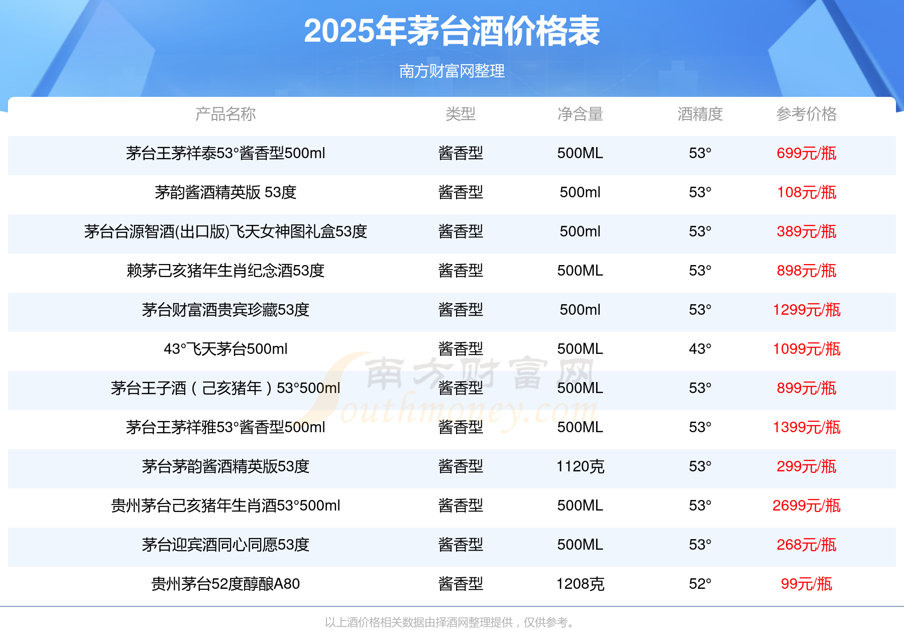 2025年,華茅鑒藏 醬香型白酒 3L 53°、53度五星茅臺(tái)生肖酒丁酉雞年、貴州茅臺(tái)己亥豬年生肖酒53°500ml、53度五星茅臺(tái)生肖酒戊戌狗年、飛天茅臺(tái)53°500ml(2015年)、茅臺(tái)王子酒己亥豬年生肖紀(jì)念酒53度2.5L、茅臺(tái)1935醬香型53度、茅臺(tái)財(cái)富貴賓典藏酒53度等茅臺(tái)酒價(jià)格如下:華茅鑒藏 醬香型白酒 3L 53°參考價(jià)8388元/瓶、53度五星茅臺(tái)生肖酒丁酉雞年參考價(jià)2798元/瓶、貴州茅臺(tái)己亥豬年生肖酒53°500ml參考價(jià)2699元/瓶、53度五星茅臺(tái)生肖酒戊戌狗年參考價(jià)2698元/瓶、飛天茅臺(tái)53°500ml(2015年)參考價(jià)2199元/瓶、茅臺(tái)王子酒己亥豬年生肖紀(jì)念酒53度2.5L參考價(jià)2099元/瓶、茅臺(tái)1935醬香型53度參考價(jià)1799元/瓶、茅臺(tái)財(cái)富貴賓典藏酒53度參考價(jià)1599元/瓶。