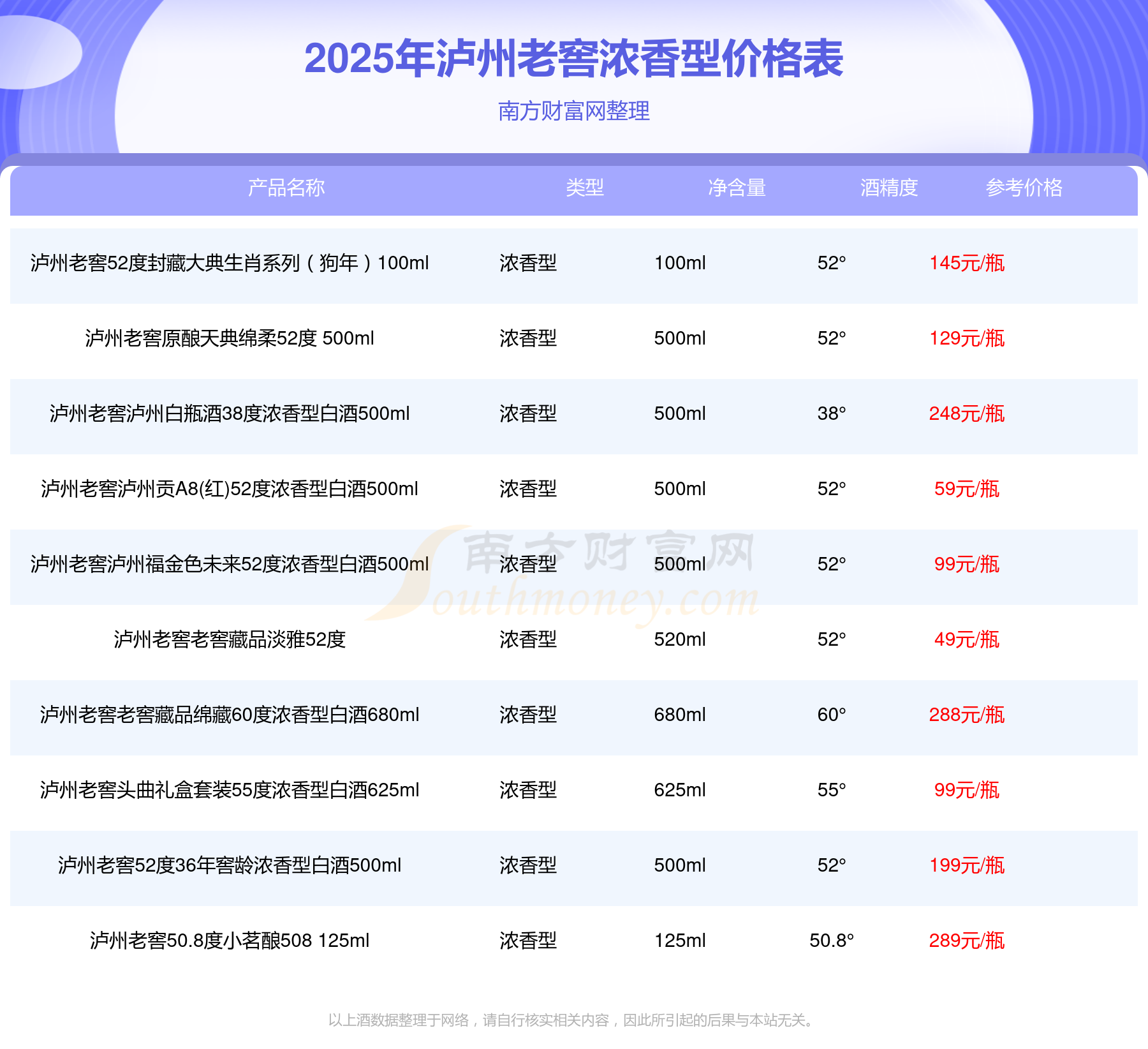 2025瀘州老窖濃香型酒最新價(jià)格:瀘州老窖國(guó)窖1573春釀鼠兆豐年E 55度參考價(jià)17999元/瓶、瀘州老窖國(guó)窖1573生命中的那壇酒55度014參考價(jià)9999元/瓶、瀘州老窖國(guó)窖1573春釀鼠兆豐年A 55度參考價(jià)5088元/瓶、瀘州老窖國(guó)窖1573生命中的那壇酒55度013濃香型白酒1000ml參考價(jià)4988元/瓶、瀘州老窖國(guó)窖1573生命中的那壇酒55度009 1000ml參考價(jià)4288元/瓶、瀘州老窖國(guó)窖1573中國(guó)品味52度濃香型白酒500ml參考價(jià)2888元/瓶。