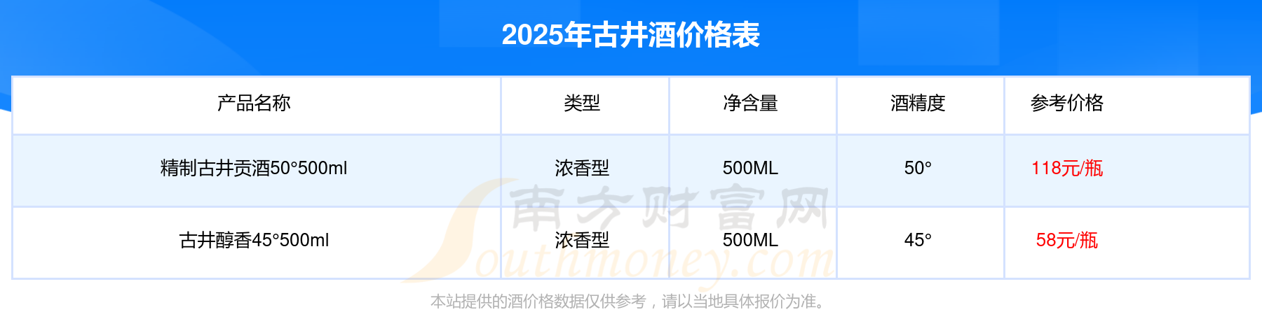2025年,古井酒價(jià)格最高的是精制古井貢酒50°500ml,參考價(jià)118元,最低的是古井醇香45°500ml,參考價(jià)58元,價(jià)格高低差為60元。