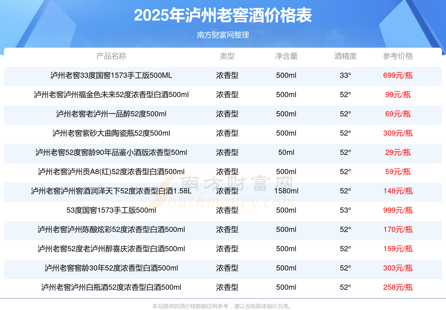 瀘州老窖國窖1573春釀鼠兆豐年E 55度參考價17999元/瓶、瀘州老窖國窖1573生命中的那壇酒55度014參考價9999元/瓶、瀘州老窖國窖1573春釀鼠兆豐年A 55度參考價5088元/瓶、瀘州老窖國窖1573生命中的那壇酒55度013濃香型白酒1000ml參考價4988元/瓶、瀘州老窖國窖1573生命中的那壇酒55度009 1000ml參考價4288元/瓶、瀘州老窖國窖1573中國品味52度濃香型白酒500ml參考價2888元/瓶。
