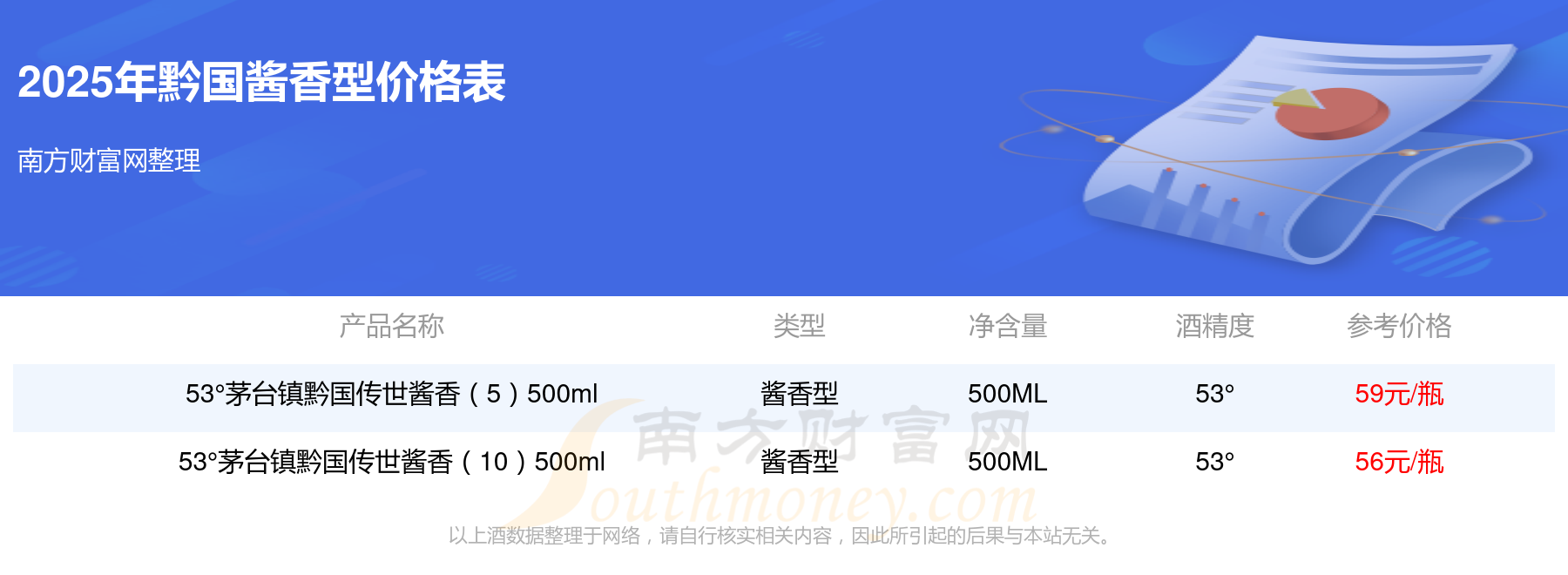 53°茅臺鎮(zhèn)黔國傳世醬香(5)500ml參考價59元/瓶、53°茅臺鎮(zhèn)黔國傳世醬香(10)500ml參考價56元/瓶。