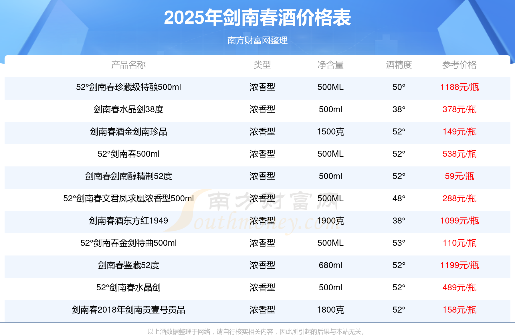 劍南春鑒藏52度參考價(jià)1199元/瓶、52°劍南春珍藏級(jí)特釀500ml參考價(jià)1188元/瓶、劍南春酒東方紅1949參考價(jià)1099元/瓶、52°劍南春500ml參考價(jià)538元/瓶、52°劍南春水晶劍參考價(jià)489元/瓶、劍南春水晶劍38度參考價(jià)378元/瓶、52°劍南春文君鳳求凰濃香型500ml參考價(jià)288元/瓶。