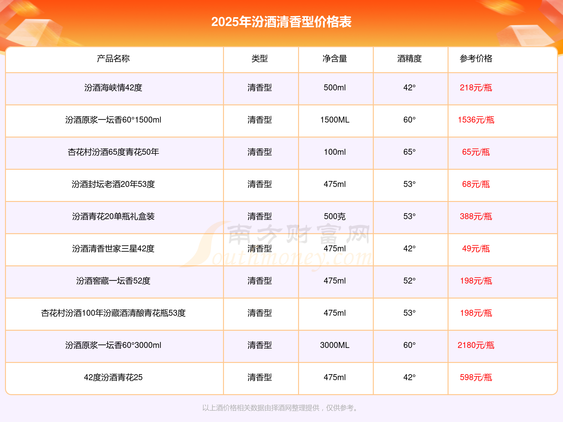 當(dāng)前汾酒清香型酒價(jià)格最高的酒為汾酒原漿一壇香60°3000ml,參考價(jià)2180元/瓶,而汾酒清香型酒價(jià)格最低的是汾酒百年汾杏酒純釀53度,參考價(jià)28元/瓶,價(jià)格高低差為2152元/瓶。