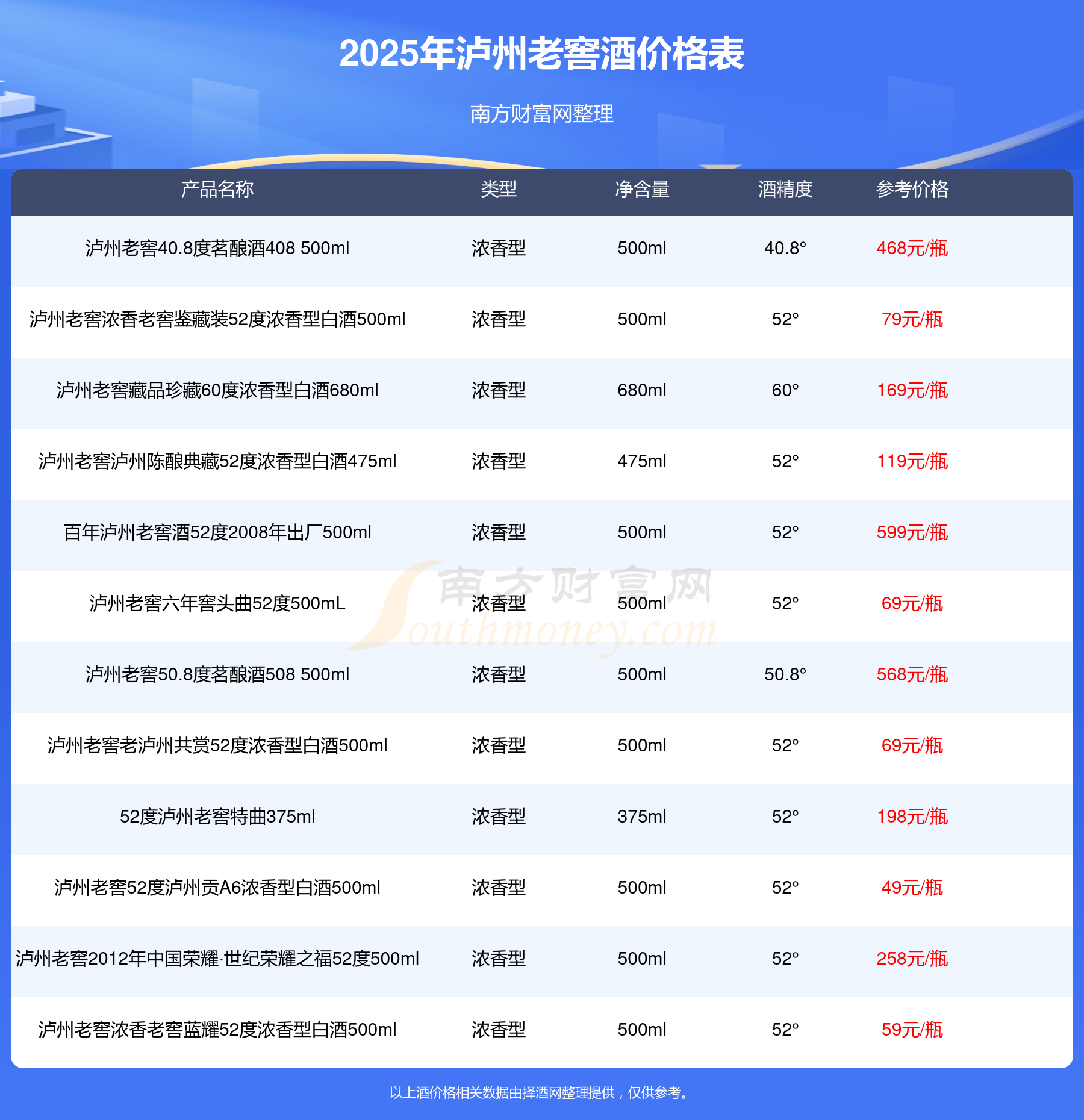 2025年,瀘州老窖國窖1573春釀鼠兆豐年E 55度、瀘州老窖國窖1573生命中的那壇酒55度014、瀘州老窖國窖1573春釀鼠兆豐年A 55度、瀘州老窖國窖1573生命中的那壇酒55度013濃香型白酒1000ml、瀘州老窖國窖1573生命中的那壇酒55度009 1000ml、瀘州老窖國窖1573中國品味52度濃香型白酒500ml、瀘州老窖國窖1573許燎源概念作品58度濃香型白酒1000ml、瀘州老窖52度國窖1573狗年生肖禮盒等瀘州老窖酒價(jià)格如下:瀘州老窖國窖1573春釀鼠兆豐年E 55度參考價(jià)17999元/瓶、瀘州老窖國窖1573生命中的那壇酒55度014參考價(jià)9999元/瓶、瀘州老窖國窖1573春釀鼠兆豐年A 55度參考價(jià)5088元/瓶、瀘州老窖國窖1573生命中的那壇酒55度013濃香型白酒1000ml參考價(jià)4988元/瓶、瀘州老窖國窖1573生命中的那壇酒55度009 1000ml參考價(jià)4288元/瓶、瀘州老窖國窖1573中國品味52度濃香型白酒500ml參考價(jià)2888元/瓶、瀘州老窖國窖1573許燎源概念作品58度濃香型白酒1000ml參考價(jià)2680元/瓶、瀘州老窖52度國窖1573狗年生肖禮盒參考價(jià)2143元/瓶。