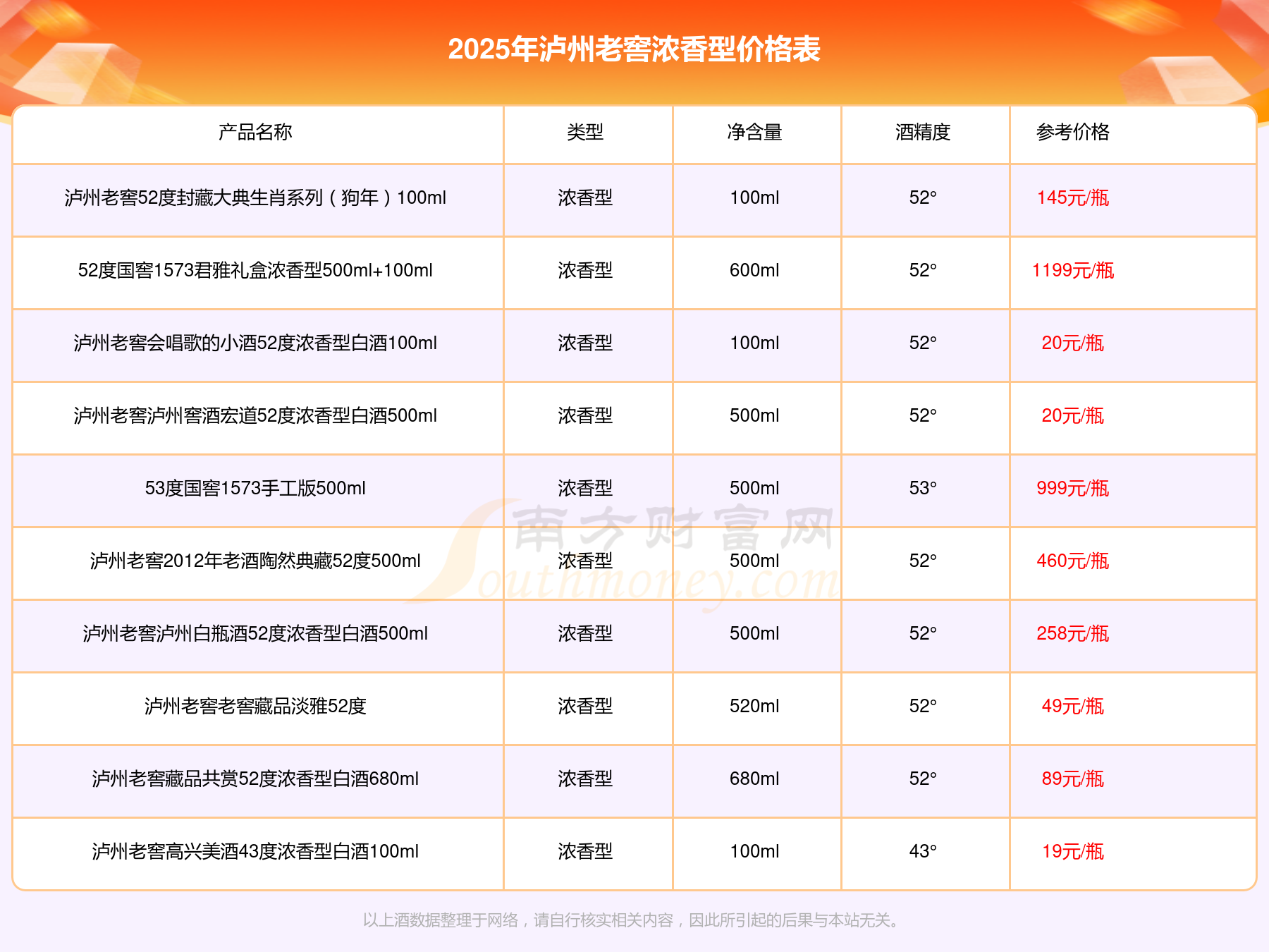 2025年瀘州老窖濃香型酒瀘州老窖國窖1573春釀鼠兆豐年E 55度、瀘州老窖國窖1573生命中的那壇酒55度014、瀘州老窖國窖1573春釀鼠兆豐年A 55度、瀘州老窖國窖1573生命中的那壇酒55度013濃香型白酒1000ml、瀘州老窖國窖1573生命中的那壇酒55度009 1000ml、瀘州老窖國窖1573中國品味52度濃香型白酒500ml等最新價(jià)格如下: