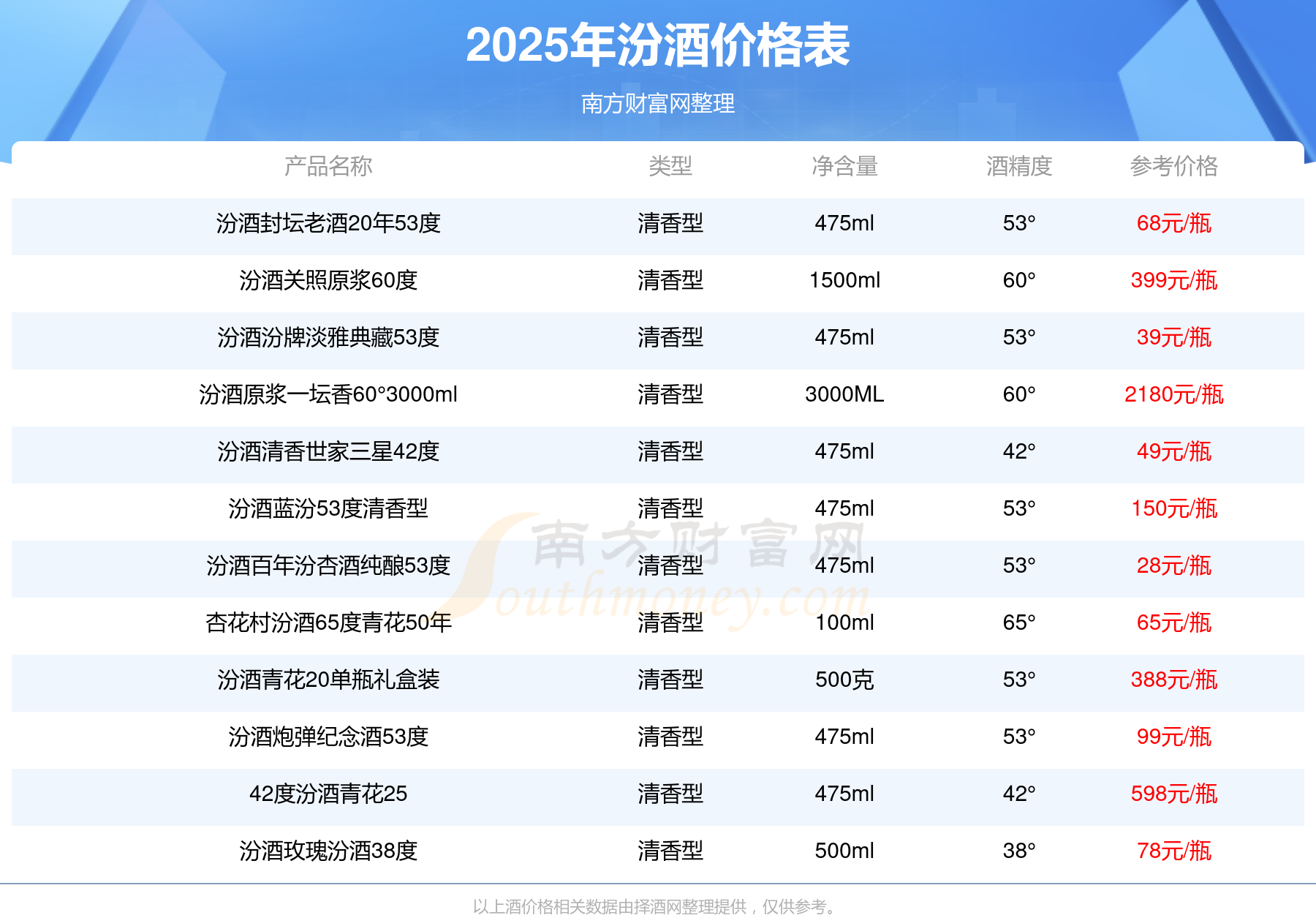 汾酒原漿一壇香60°3000ml參考價2180元/瓶、汾酒原漿一壇香60°1500ml參考價1536元/瓶、42度汾酒青花25參考價598元/瓶、汾酒收藏系列盤古汾酒55度參考價400元/瓶、汾酒關照原漿60度參考價399元/瓶、汾酒青花20單瓶禮盒裝參考價388元/瓶。