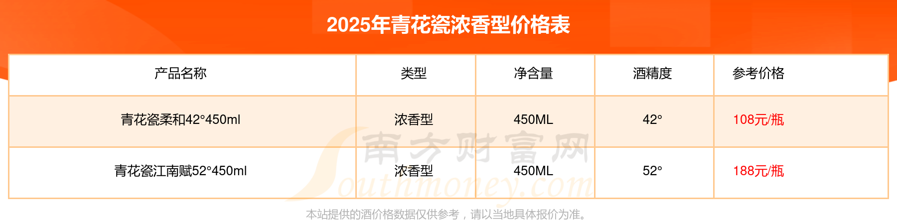 2025年青花瓷濃香型酒青花瓷江南賦52°450ml、青花瓷柔和42°450ml等最新價(jià)格如下:青花瓷江南賦52°450ml參考價(jià)188元/瓶、青花瓷柔和42°450ml參考價(jià)108元/瓶。
