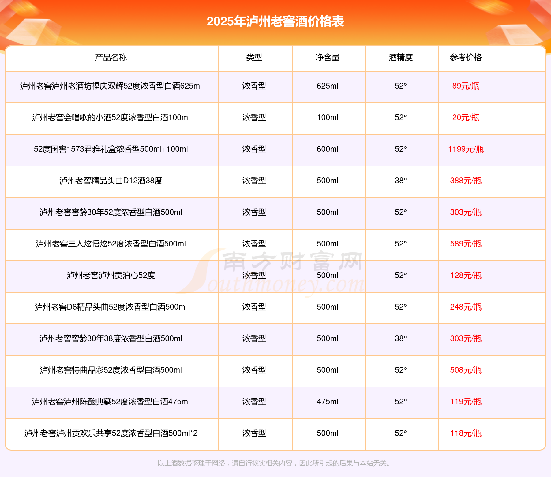 2025年,瀘州老窖國窖1573春釀鼠兆豐年E 55度、瀘州老窖國窖1573生命中的那壇酒55度014、瀘州老窖國窖1573春釀鼠兆豐年A 55度、瀘州老窖國窖1573生命中的那壇酒55度013濃香型白酒1000ml、瀘州老窖國窖1573生命中的那壇酒55度009 1000ml等瀘州老窖酒價格如下:瀘州老窖國窖1573春釀鼠兆豐年E 55度參考價17999元/瓶、瀘州老窖國窖1573生命中的那壇酒55度014參考價9999元/瓶、瀘州老窖國窖1573春釀鼠兆豐年A 55度參考價5088元/瓶、瀘州老窖國窖1573生命中的那壇酒55度013濃香型白酒1000ml參考價4988元/瓶、瀘州老窖國窖1573生命中的那壇酒55度009 1000ml參考價4288元/瓶。