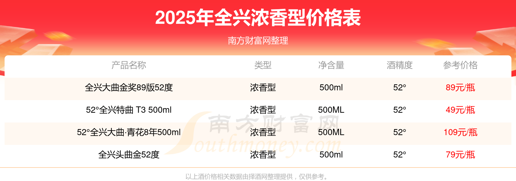 52°全興大曲·青花8年500ml參考價109元/瓶、全興大曲金獎89版52度參考價89元/瓶、全興頭曲金52度參考價79元/瓶、52°全興特曲 T3 500ml參考價49元/瓶。