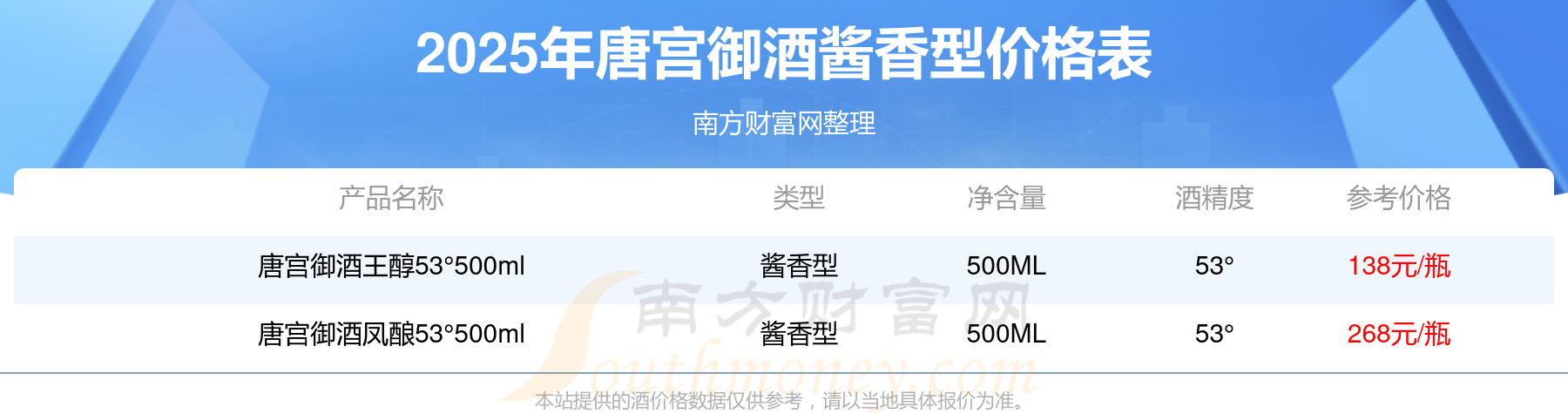 唐宮御酒鳳釀53°500ml參考價268元/瓶、唐宮御酒王醇53°500ml參考價138元/瓶。