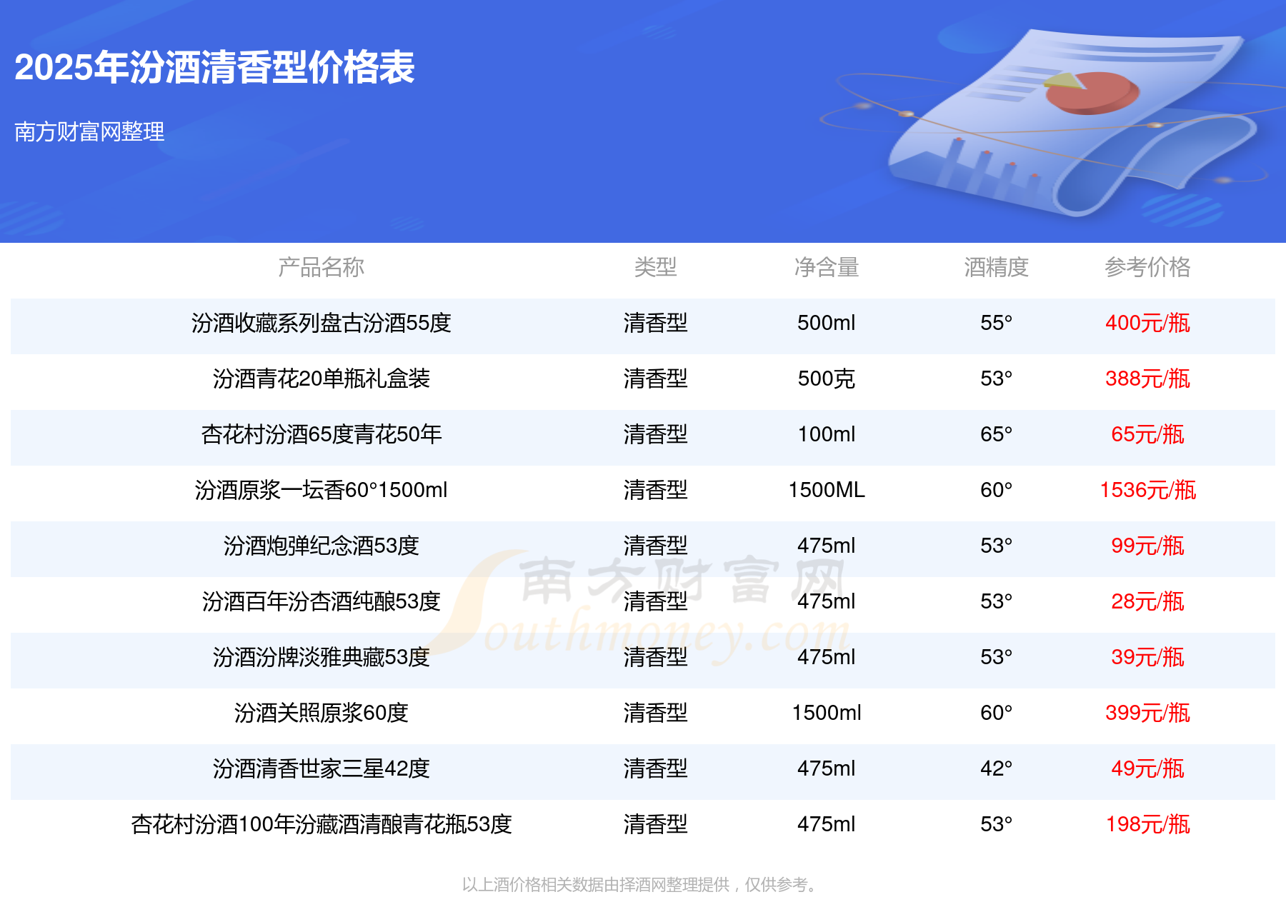 2025汾酒清香型酒最新價格:汾酒原漿一壇香60°3000ml參考價2180元/瓶、汾酒原漿一壇香60°1500ml參考價1536元/瓶、42度汾酒青花25參考價598元/瓶、汾酒收藏系列盤古汾酒55度參考價400元/瓶。