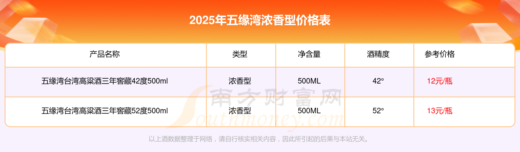 五緣灣濃香型酒最新價(jià)格2025:五緣灣臺(tái)灣高粱酒三年窖藏52度500ml參考價(jià)13元/瓶、五緣灣臺(tái)灣高粱酒三年窖藏42度500ml參考價(jià)12元/瓶。