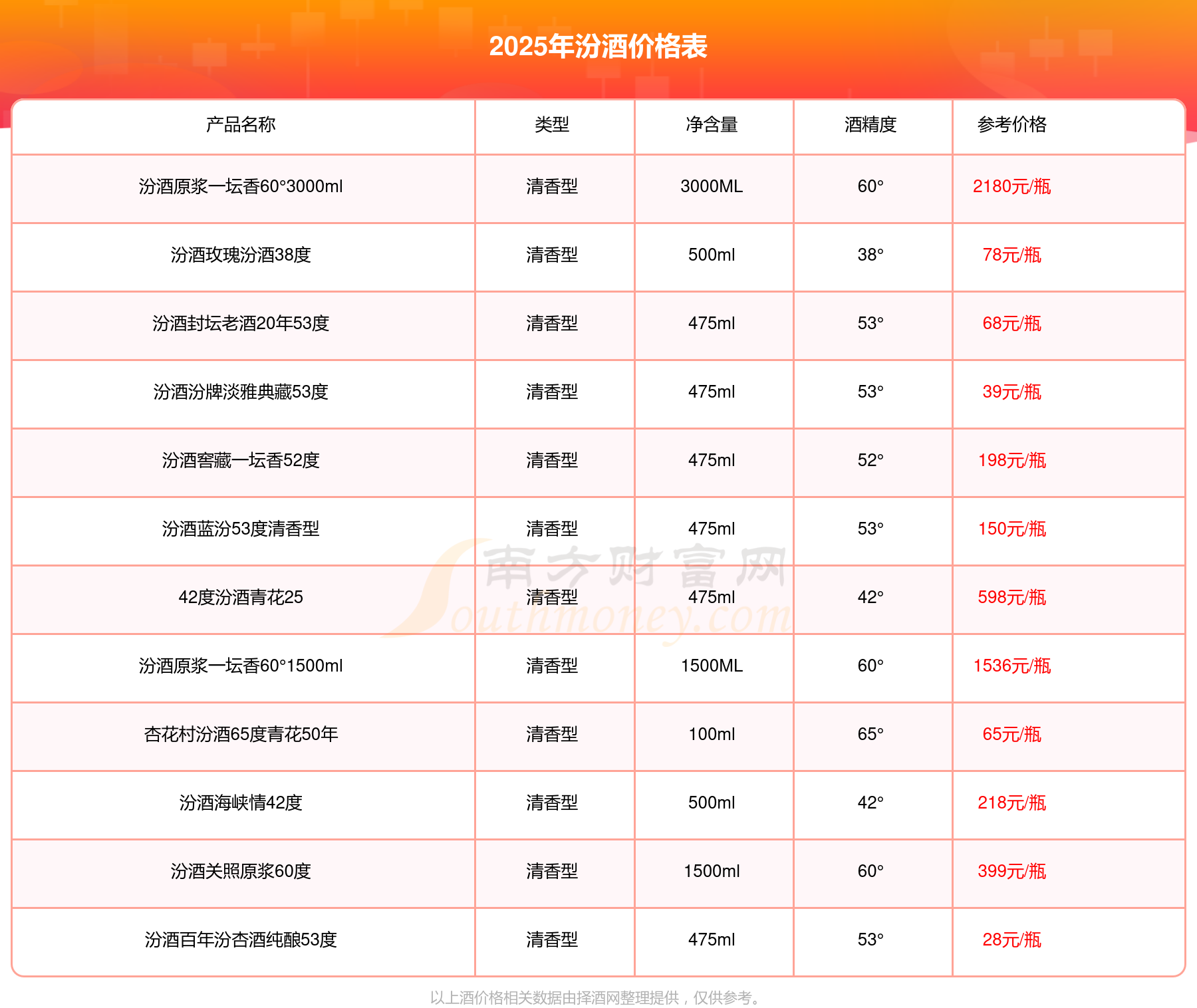 2025年汾酒價(jià)格最高的酒是汾酒原漿一壇香60°3000ml,參考價(jià)2180元/瓶,最低的是汾酒百年汾杏酒純釀53度,參考價(jià)28元/瓶,價(jià)格高低差為2152元/瓶。