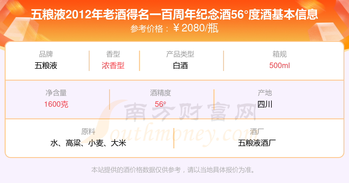 五糧液2012年老酒得名一百周年紀念酒56°度基本信息