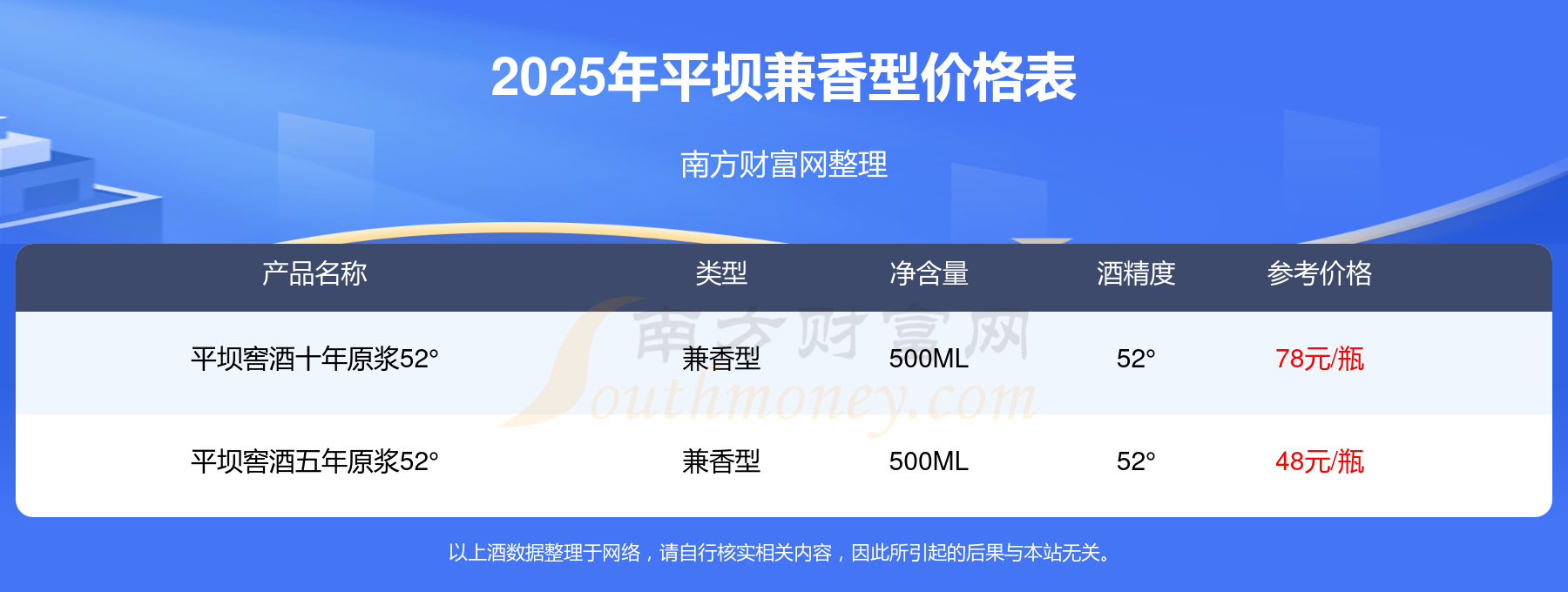 2025年,平壩兼香型酒價(jià)格最高的是平壩窖酒十年原漿52°,參考價(jià)78元,最低的是平壩窖酒五年原漿52°,參考價(jià)48元,價(jià)格高低差為30元。