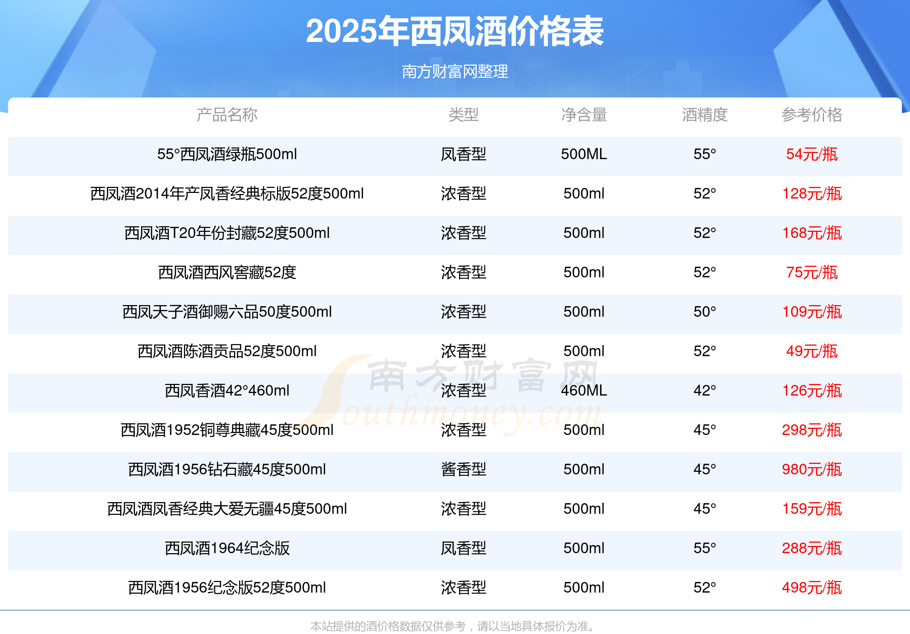2025年,西鳳酒 酒海私藏55度3000ml、西鳳酒1952金獎50 55度500ml、西鳳酒2013年產(chǎn)老酒鳳香經(jīng)典30年52度500ml、西鳳酒1956鉆石藏45度500ml、西鳳酒1952金獎30 55度500ml、西鳳酒鳳香經(jīng)典20年52度500ml等西鳳酒價格如下: