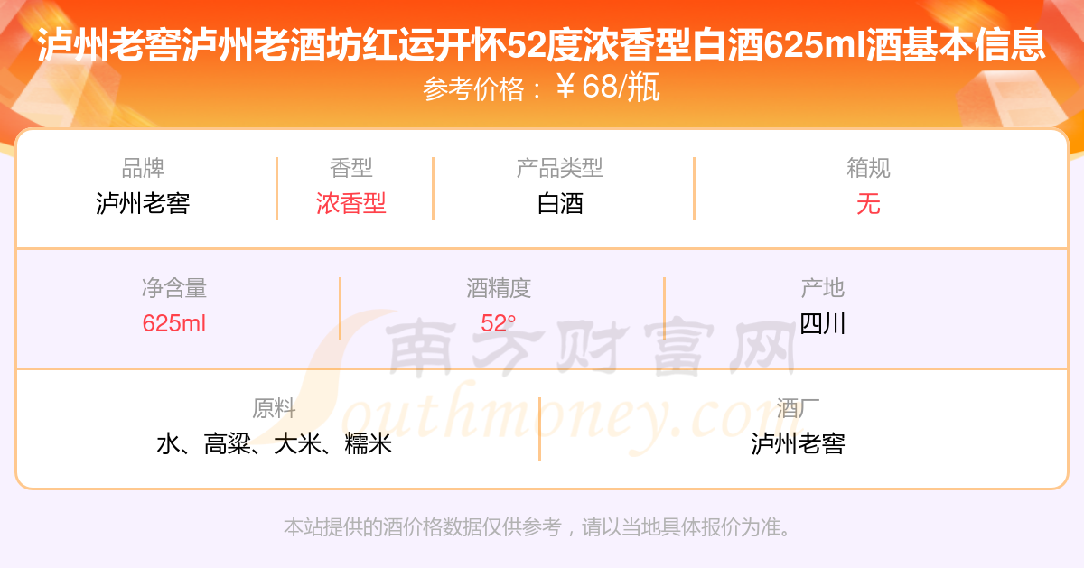 瀘州老窖瀘州老酒坊紅運開懷52度濃香型白酒625ml基本信息