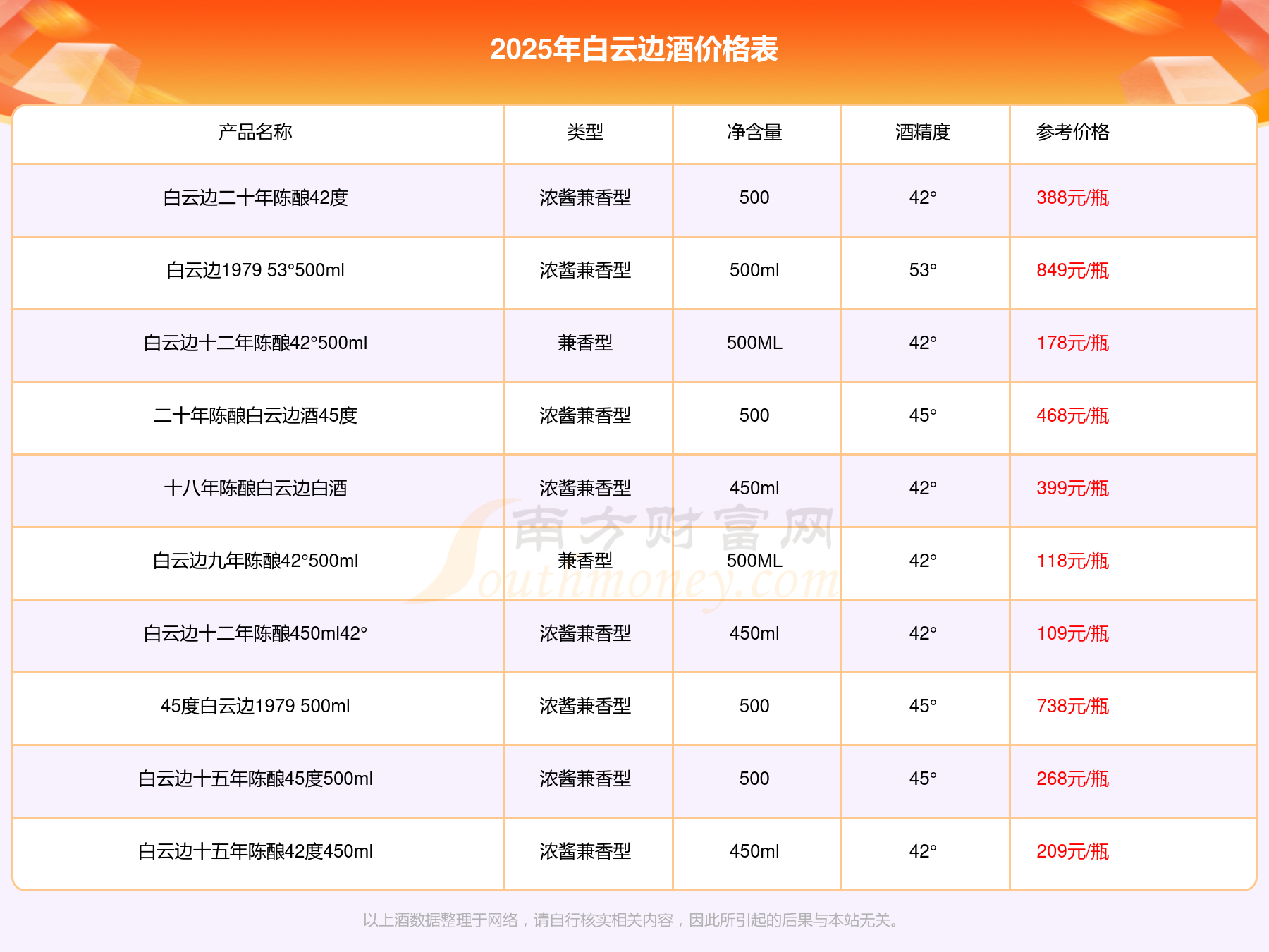 2025白云邊酒最新價(jià)格:白云邊1979 53°500ml參考價(jià)849元/瓶、45度白云邊1979 500ml參考價(jià)738元/瓶、二十年陳釀白云邊酒45度參考價(jià)468元/瓶、十八年陳釀白云邊白酒參考價(jià)399元/瓶、白云邊二十年陳釀42度參考價(jià)388元/瓶、白云邊十五年陳釀45度500ml參考價(jià)268元/瓶、白云邊十五年陳釀42度450ml參考價(jià)209元/瓶。