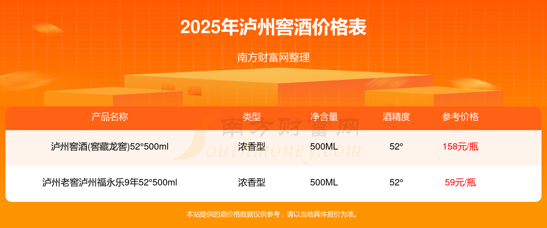 瀘州窖酒(窖藏龍窖)52°500ml參考價158元/瓶、瀘州老窖瀘州福永樂9年52°500ml參考價59元/瓶。