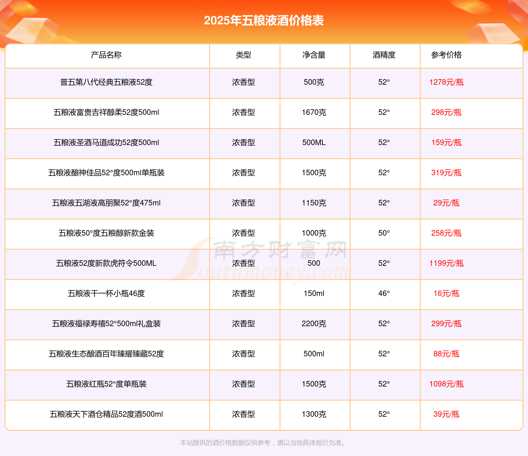 當(dāng)下五糧液酒價(jià)格最高的酒為五糧液百年世博世紀(jì)榮耀紀(jì)念酒60°999ml,參考價(jià)26980元/瓶,而五糧液酒價(jià)格最低的是五糧液干一杯小瓶46度,參考價(jià)16元/瓶,價(jià)格高低差為26964元/瓶。