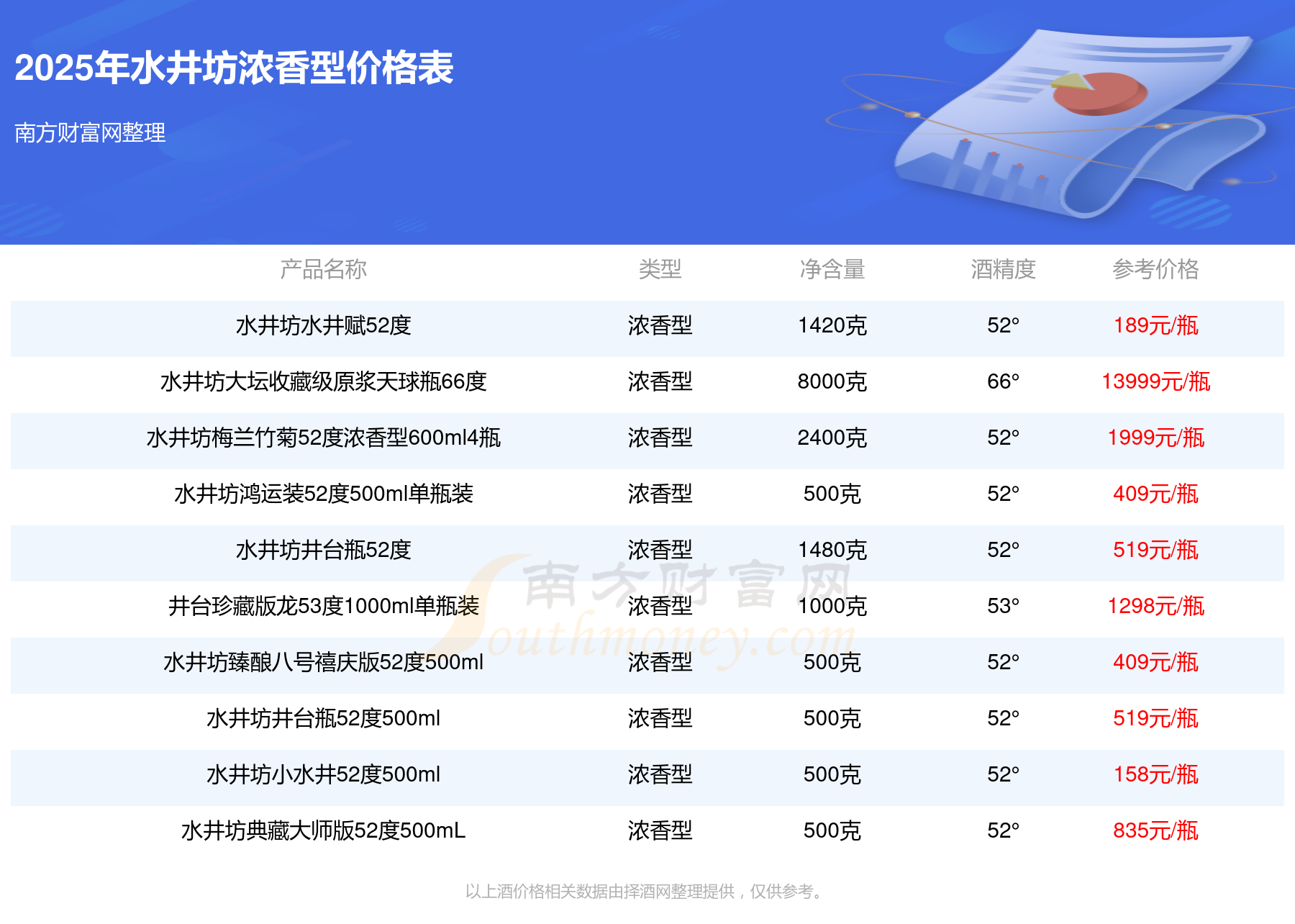 2025年,水井坊大壇收藏級(jí)原漿天球瓶66度、水井坊博物館壹號(hào)53度雙瓶裝、53°水井坊公元十三600ml、水井坊梅蘭竹菊52度濃香型600ml4瓶、水井坊菁翠52度500ml、井臺(tái)珍藏版龍53度1000ml單瓶裝、井臺(tái)珍藏版鳳53度1000ml單瓶裝等水井坊濃香型酒參考價(jià)格如下:水井坊大壇收藏級(jí)原漿天球瓶66度參考價(jià)13999元、水井坊博物館壹號(hào)53度雙瓶裝參考價(jià)10988元、53°水井坊公元十三600ml參考價(jià)2580元、水井坊梅蘭竹菊52度濃香型600ml4瓶參考價(jià)1999元、水井坊菁翠52度500ml參考價(jià)1650元、井臺(tái)珍藏版龍53度1000ml單瓶裝參考價(jià)1298元、井臺(tái)珍藏版鳳53度1000ml單瓶裝參考價(jià)1298元。