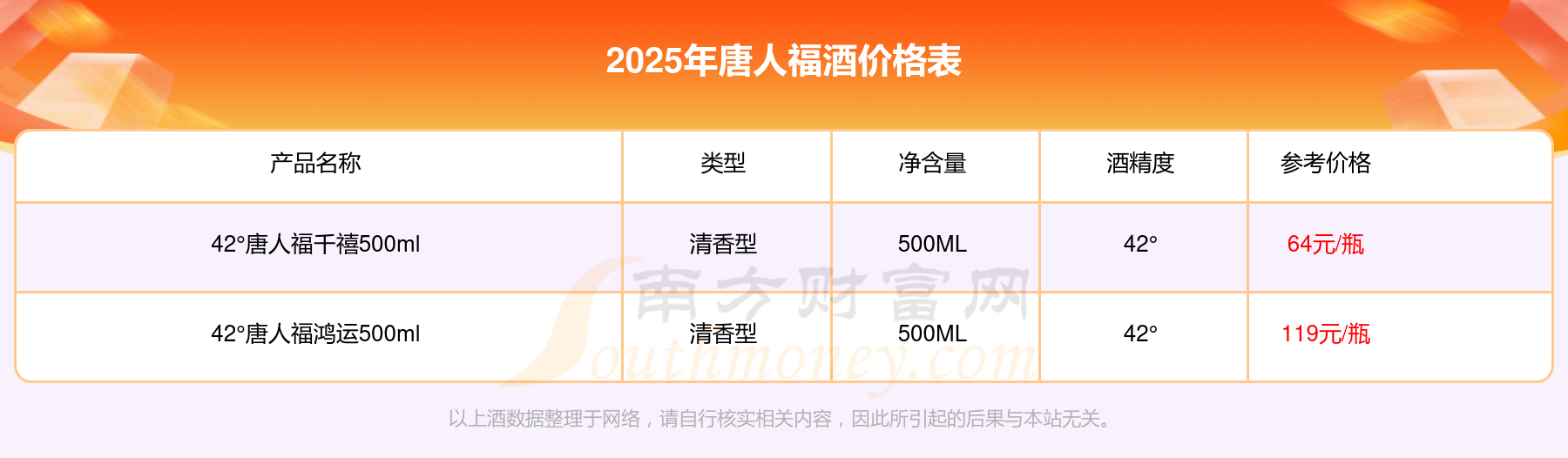 2025年,42°唐人福鴻運(yùn)500ml、42°唐人福千禧500ml等唐人福酒價(jià)格如下:42°唐人福鴻運(yùn)500ml參考價(jià)119元/瓶、42°唐人福千禧500ml參考價(jià)64元/瓶。