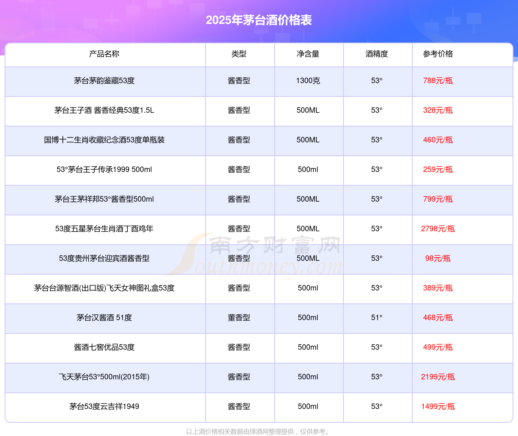 2025年茅臺價格最高的酒是華茅鑒藏 醬香型白酒 3L 53°,參考價8388元/瓶,最低的是張義齋52度原漿老窖酒,參考價58元/瓶,價格高低差為8330元/瓶。
