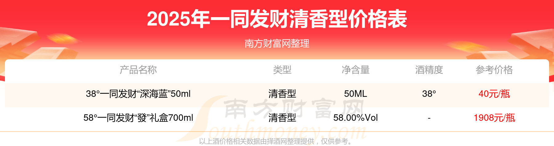 2025年,58°一同發(fā)財(cái)“發(fā)”禮盒700ml、38°一同發(fā)財(cái)“深海藍(lán)”50ml等一同發(fā)財(cái)清香型酒價(jià)格如下:58°一同發(fā)財(cái)“發(fā)”禮盒700ml參考價(jià)1908元/瓶、38°一同發(fā)財(cái)“深海藍(lán)”50ml參考價(jià)40元/瓶。