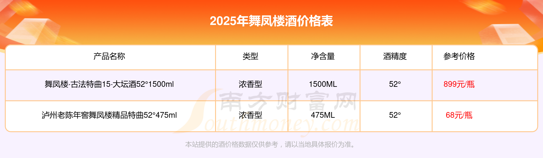 舞鳳樓·古法特曲15·大壇酒52°1500ml參考價899元/瓶、瀘州老陳年窖舞鳳樓精品特曲52°475ml參考價68元/瓶。