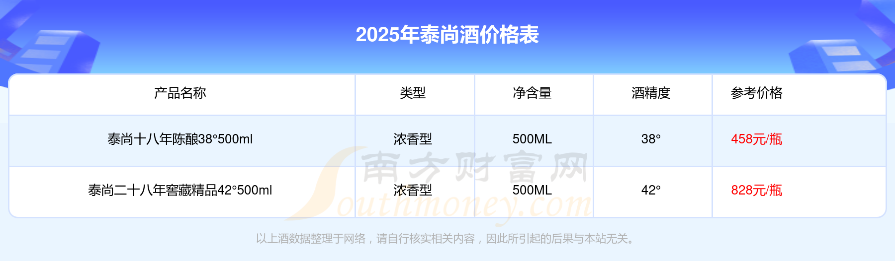 泰尚二十八年窖藏精品42°500ml參考價(jià)828元/瓶、泰尚十八年陳釀38°500ml參考價(jià)458元/瓶。