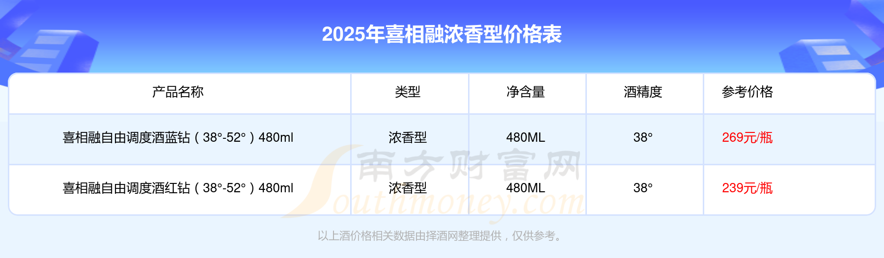 2025年,喜相融自由調度酒藍鉆(38°-52°)480ml、喜相融自由調度酒紅鉆(38°-52°)480ml等喜相融濃香型酒價格如下:喜相融自由調度酒藍鉆(38°-52°)480ml參考價269元/瓶、喜相融自由調度酒紅鉆(38°-52°)480ml參考價239元/瓶。