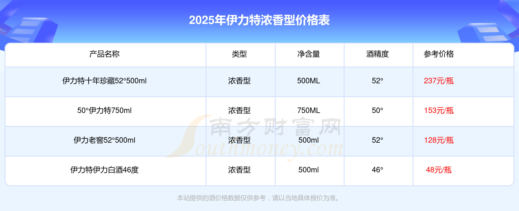 2025年,伊力特十年珍藏52°500ml、50°伊力特750ml、伊力老窖52°500ml等伊力特濃香型酒價格如下:伊力特十年珍藏52°500ml參考價237元/瓶、50°伊力特750ml參考價153元/瓶、伊力老窖52°500ml參考價128元/瓶。