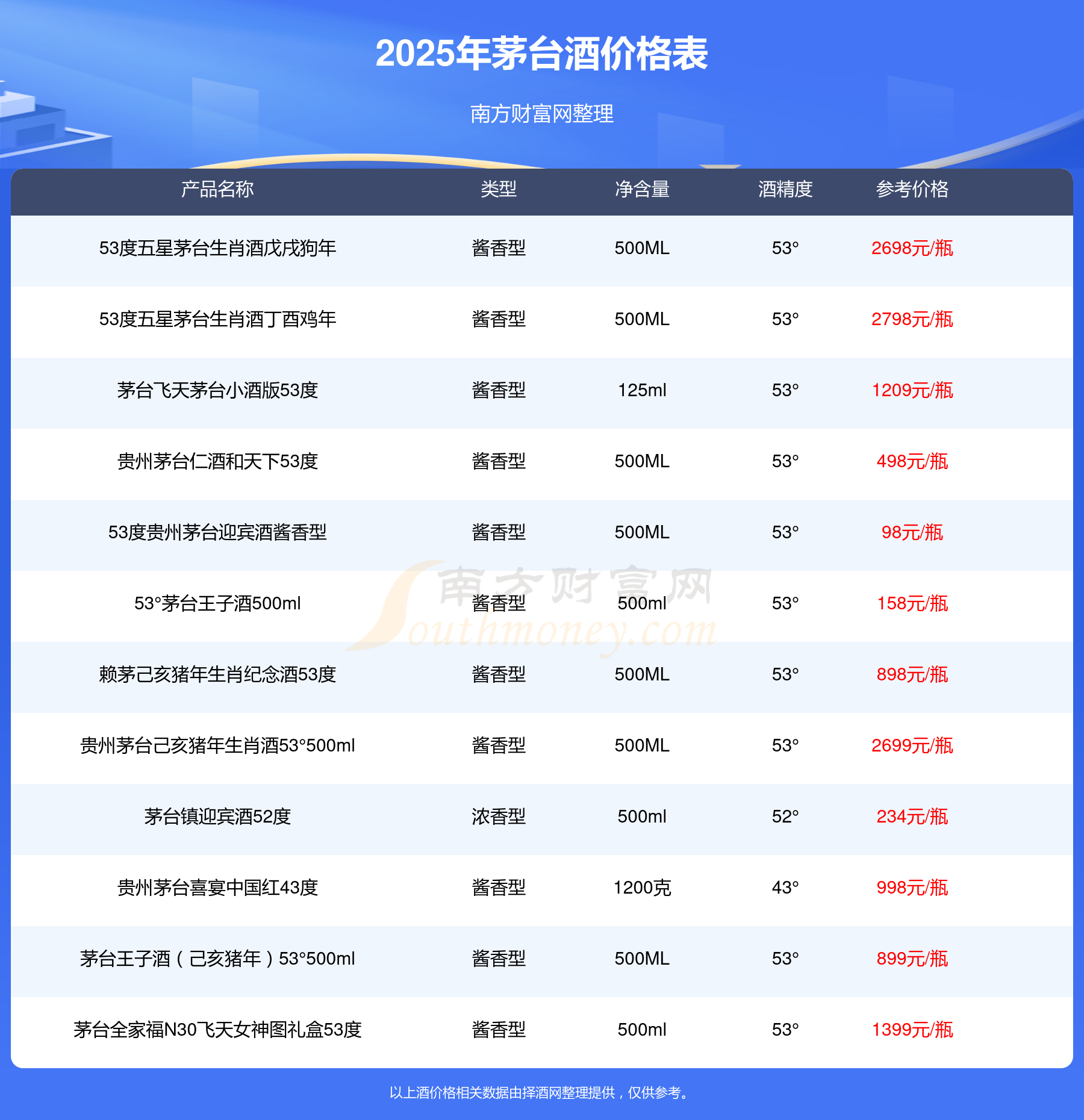 2025茅臺(tái)酒最新價(jià)格:華茅鑒藏 醬香型白酒 3L 53°參考價(jià)8388元/瓶、53度五星茅臺(tái)生肖酒丁酉雞年參考價(jià)2798元/瓶、貴州茅臺(tái)己亥豬年生肖酒53°500ml參考價(jià)2699元/瓶、53度五星茅臺(tái)生肖酒戊戌狗年參考價(jià)2698元/瓶。