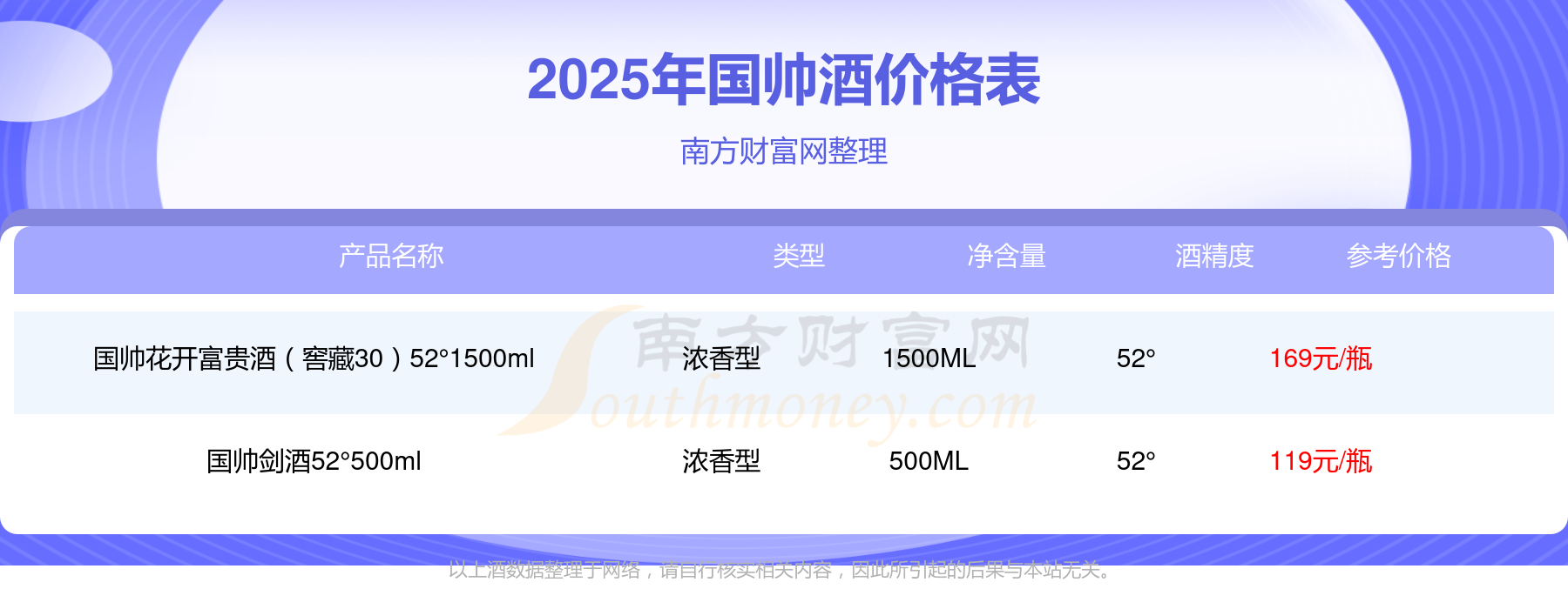 國(guó)帥酒最新價(jià)格2025:國(guó)帥花開富貴酒(窖藏30)52°1500ml參考價(jià)169元/瓶、國(guó)帥劍酒52°500ml參考價(jià)119元/瓶。