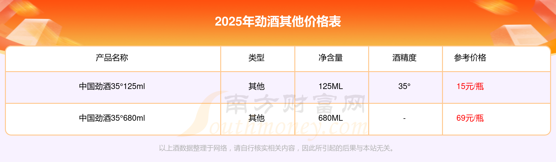 勁酒其他酒最新價格2025:中國勁酒35°680ml參考價69元/瓶、中國勁酒35°125ml參考價15元/瓶。
