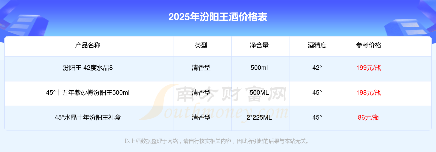 2025年汾陽王價格最高的酒是汾陽王 42度水晶8,參考價199元/瓶,最低的是45°水晶十年汾陽王禮盒,參考價86元/瓶,價格高低差為113元/瓶。