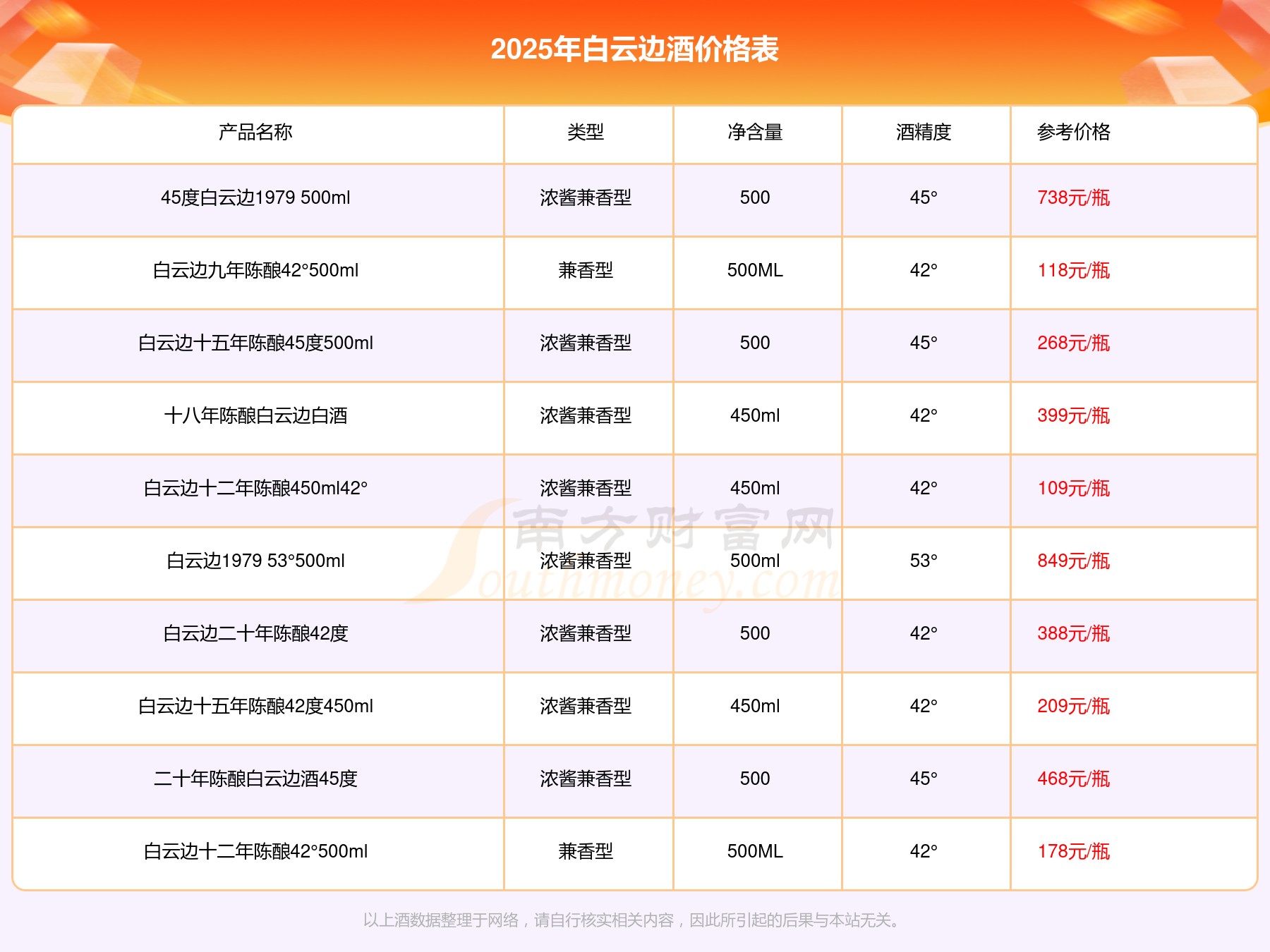 2025年,白云邊1979 53°500ml、45度白云邊1979 500ml、二十年陳釀白云邊酒45度、十八年陳釀白云邊白酒、白云邊二十年陳釀42度、白云邊十五年陳釀45度500ml等白云邊酒價(jià)格如下:
