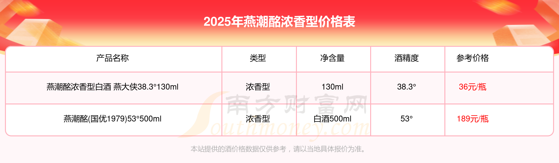 2025年,燕潮酩(國優(yōu)1979)53°500ml、燕潮酩濃香型白酒 燕大俠38.3°130ml等燕潮酩濃香型酒價格如下:燕潮酩(國優(yōu)1979)53°500ml參考價189元/瓶、燕潮酩濃香型白酒 燕大俠38.3°130ml參考價36元/瓶。