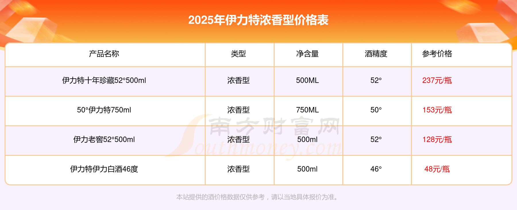 2025年,伊力特十年珍藏52°500ml、50°伊力特750ml、伊力老窖52°500ml、伊力特伊力白酒46度等伊力特濃香型酒價格如下:伊力特十年珍藏52°500ml參考價237元/瓶、50°伊力特750ml參考價153元/瓶、伊力老窖52°500ml參考價128元/瓶、伊力特伊力白酒46度參考價48元/瓶。