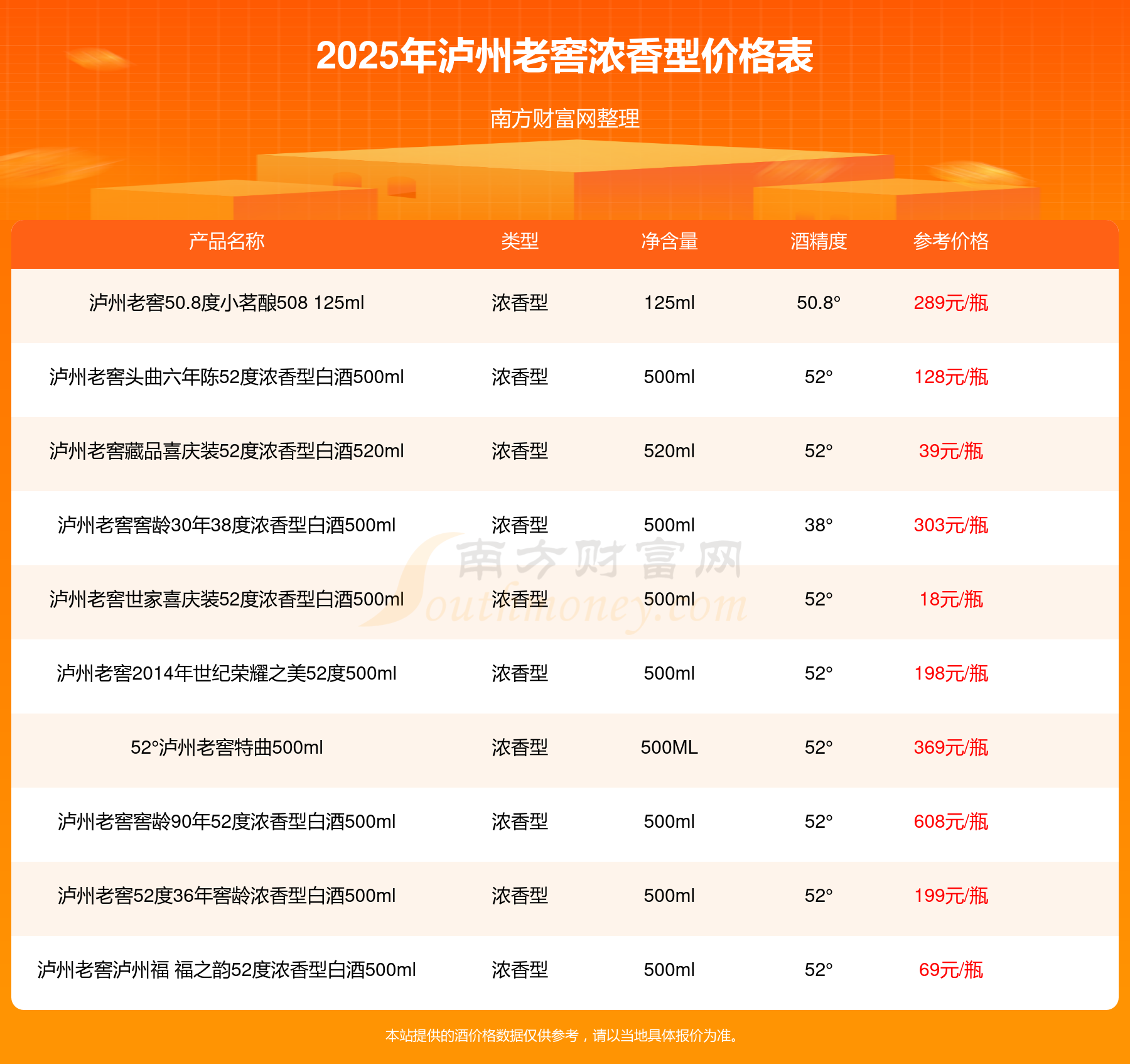 2025瀘州老窖濃香型酒最新價(jià)格:瀘州老窖國(guó)窖1573春釀鼠兆豐年E 55度參考價(jià)17999元/瓶、瀘州老窖國(guó)窖1573生命中的那壇酒55度014參考價(jià)9999元/瓶、瀘州老窖國(guó)窖1573春釀鼠兆豐年A 55度參考價(jià)5088元/瓶、瀘州老窖國(guó)窖1573生命中的那壇酒55度013濃香型白酒1000ml參考價(jià)4988元/瓶、瀘州老窖國(guó)窖1573生命中的那壇酒55度009 1000ml參考價(jià)4288元/瓶、瀘州老窖國(guó)窖1573中國(guó)品味52度濃香型白酒500ml參考價(jià)2888元/瓶。