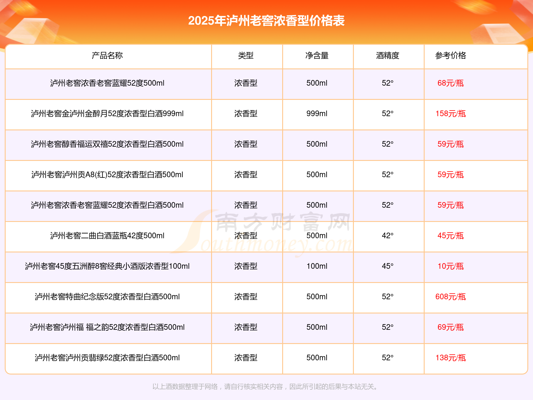 2025瀘州老窖濃香型酒最新價(jià)格:瀘州老窖國(guó)窖1573春釀鼠兆豐年E 55度參考價(jià)17999元/瓶、瀘州老窖國(guó)窖1573生命中的那壇酒55度014參考價(jià)9999元/瓶、瀘州老窖國(guó)窖1573春釀鼠兆豐年A 55度參考價(jià)5088元/瓶、瀘州老窖國(guó)窖1573生命中的那壇酒55度013濃香型白酒1000ml參考價(jià)4988元/瓶。