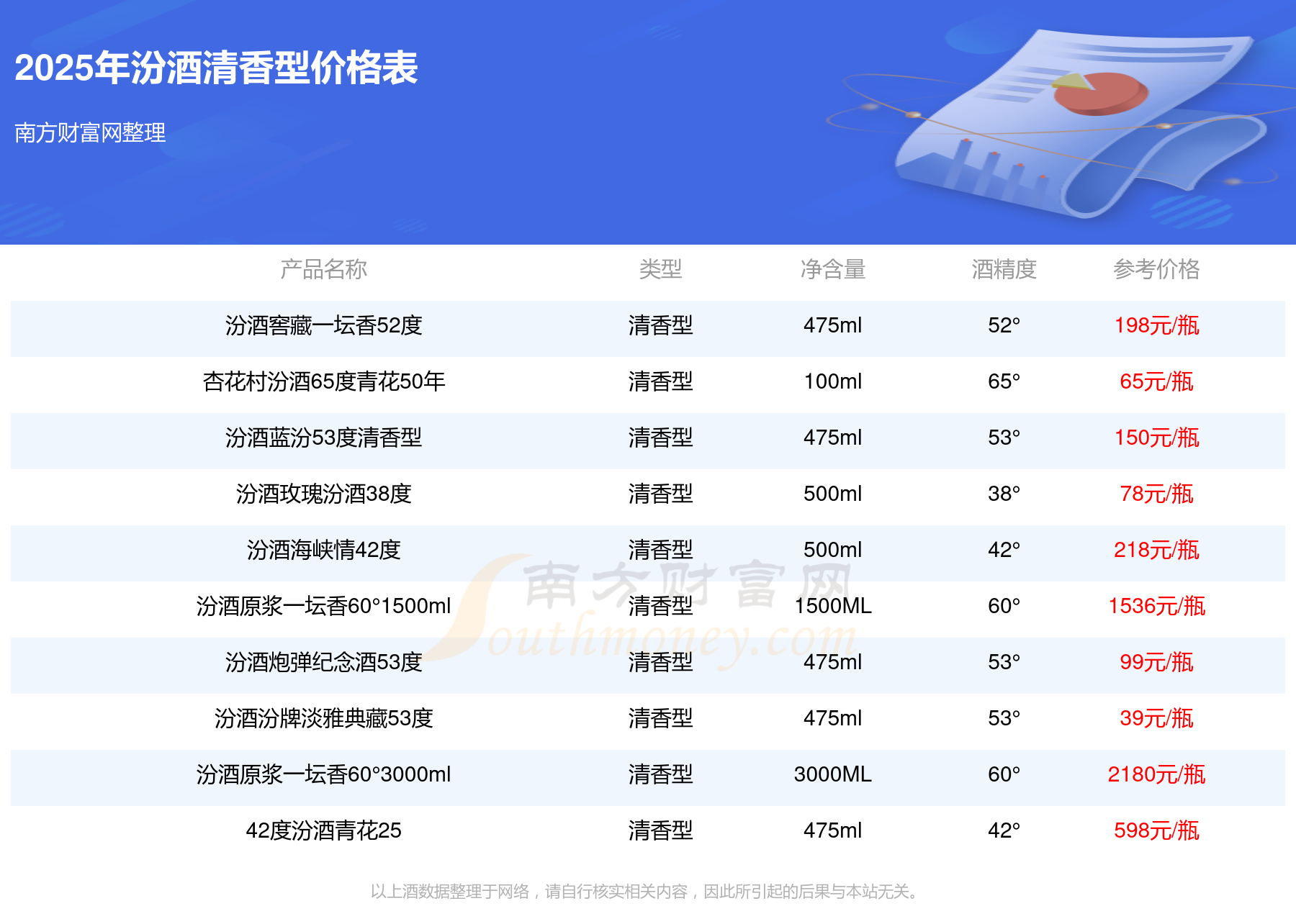 2025年,汾酒清香型酒價格最高的是汾酒原漿一壇香60°3000ml,參考價2180元,最低的是汾酒百年汾杏酒純釀53度,參考價28元,價格高低差為2152元。