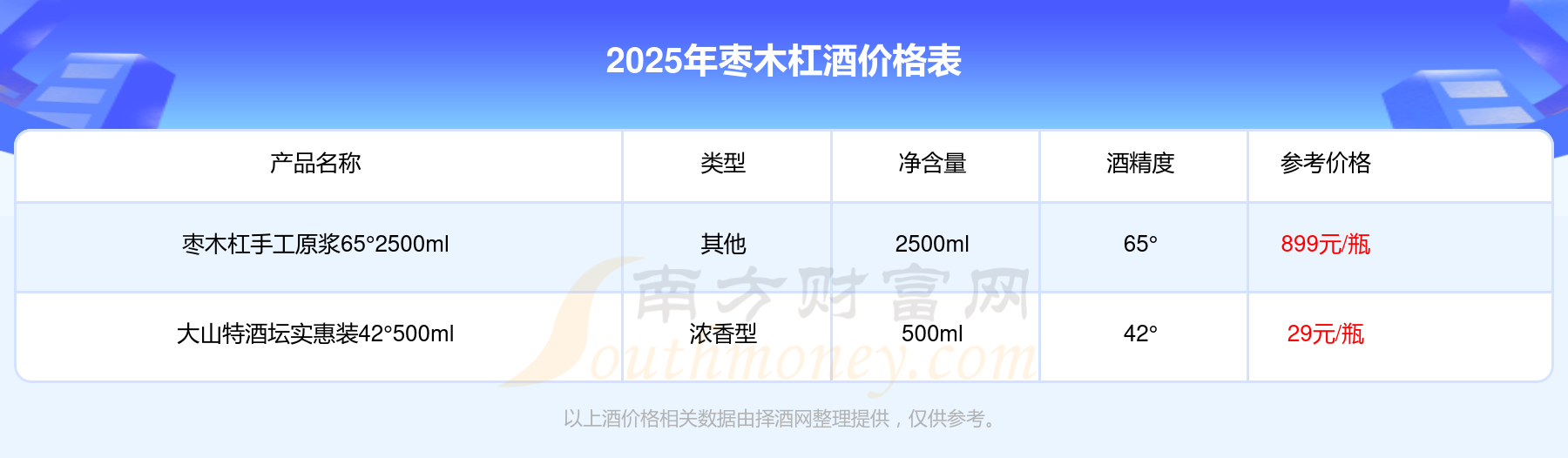 棗木杠酒最新價(jià)格2025:棗木杠手工原漿65°2500ml參考價(jià)899元/瓶、大山特酒壇實(shí)惠裝42°500ml參考價(jià)29元/瓶。