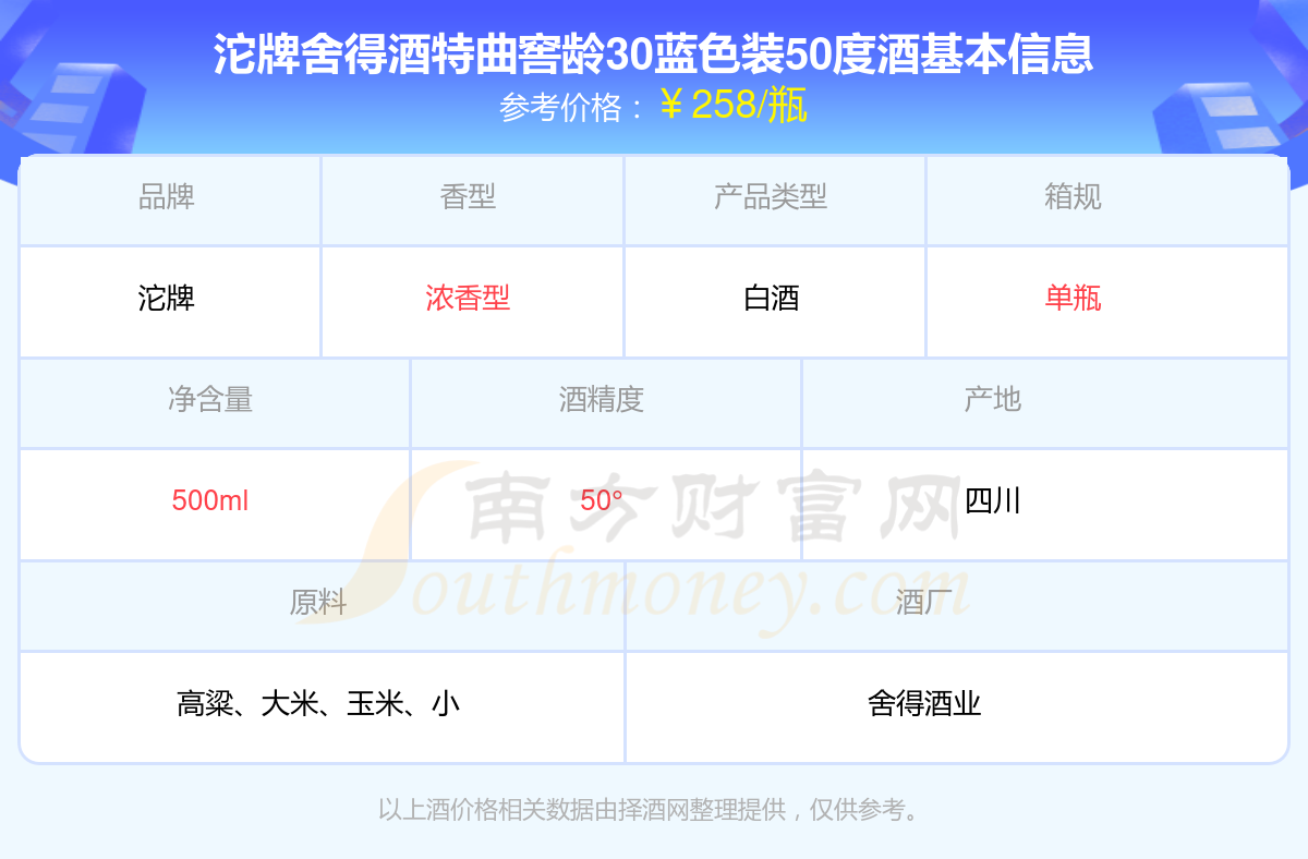 沱牌舍得酒特曲窖齡30藍(lán)色裝50度基本信息