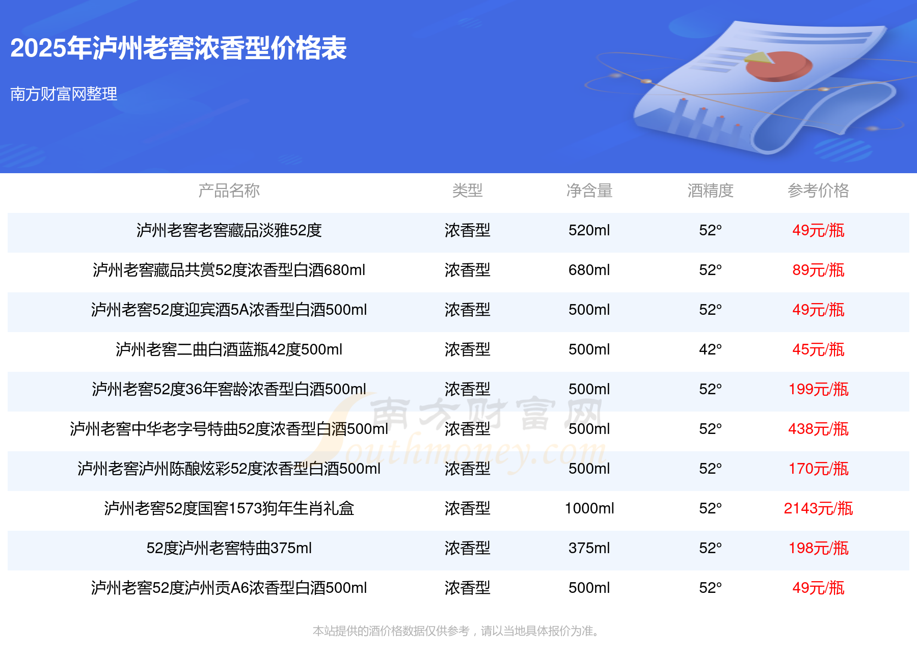 2025瀘州老窖濃香型酒最新價格:瀘州老窖國窖1573春釀鼠兆豐年E 55度參考價17999元/瓶、瀘州老窖國窖1573生命中的那壇酒55度014參考價9999元/瓶、瀘州老窖國窖1573春釀鼠兆豐年A 55度參考價5088元/瓶、瀘州老窖國窖1573生命中的那壇酒55度013濃香型白酒1000ml參考價4988元/瓶。