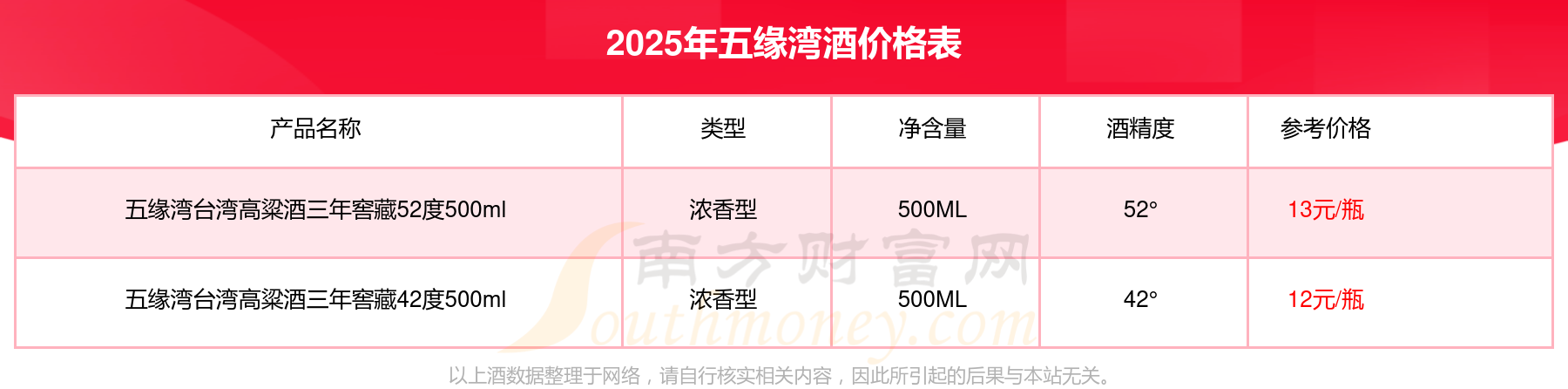 五緣灣臺灣高粱酒三年窖藏52度500ml參考價13元/瓶、五緣灣臺灣高粱酒三年窖藏42度500ml參考價12元/瓶。