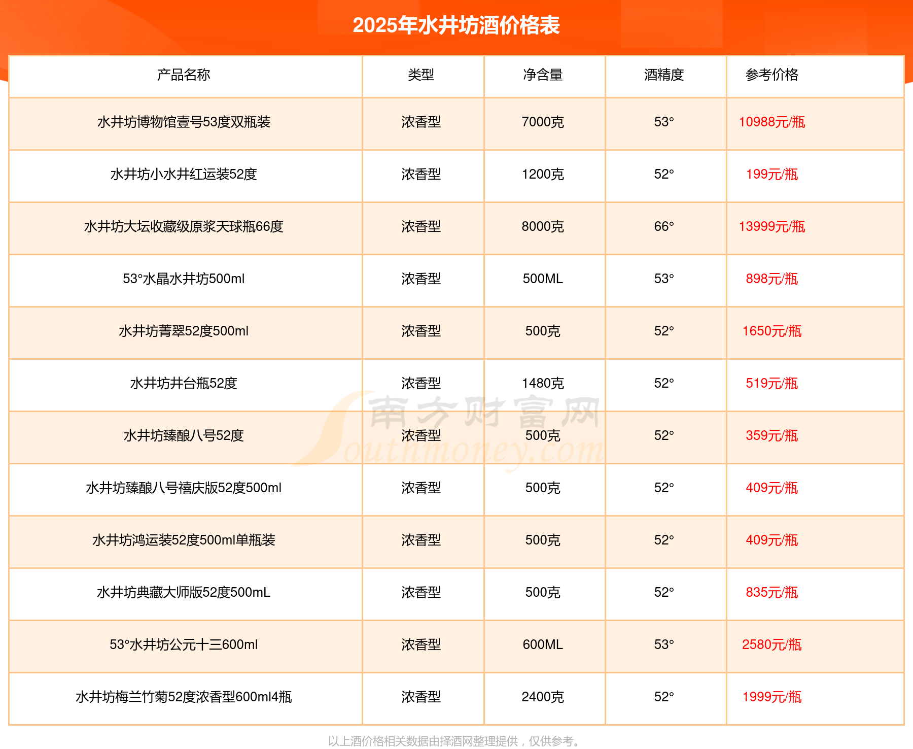 水井坊大壇收藏級原漿天球瓶66度參考價(jià)13999元/瓶、水井坊博物館壹號53度雙瓶裝參考價(jià)10988元/瓶、53°水井坊公元十三600ml參考價(jià)2580元/瓶、水井坊梅蘭竹菊52度濃香型600ml4瓶參考價(jià)1999元/瓶、水井坊菁翠52度500ml參考價(jià)1650元/瓶、井臺珍藏版龍53度1000ml單瓶裝參考價(jià)1298元/瓶。