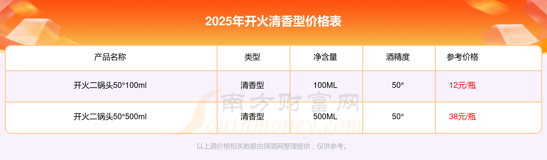 2025年,開火二鍋頭50°500ml、開火二鍋頭50°100ml等開火清香型酒價(jià)格如下: