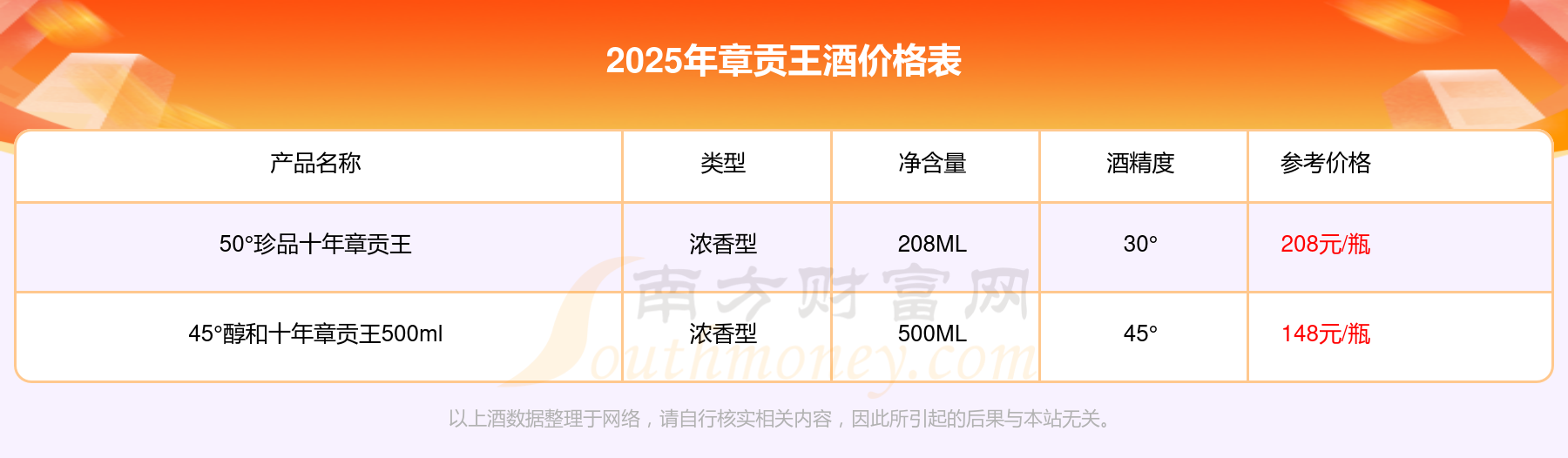章貢王酒最新價格2025:50°珍品十年章貢王參考價208元/瓶、45°醇和十年章貢王500ml參考價148元/瓶。